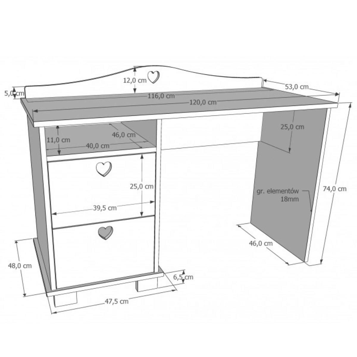 Motyw serca pełni funkcję dekoracyjną i praktyczną – zastępuje uchwyty, dzięki czemu biurko dziecięce dla dziewczynki jest bezpieczne i wygodne w użytkowaniu.