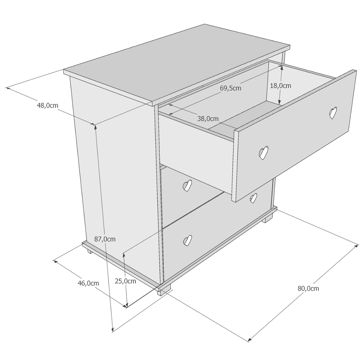 Motyw serca pełni funkcję dekoracyjną i praktyczną – zastępuje tradycyjne uchwyty, dzięki czemu komoda dziecięca dla dziewczynki jest bezpieczna i wygodna w codziennym użytkowaniu.