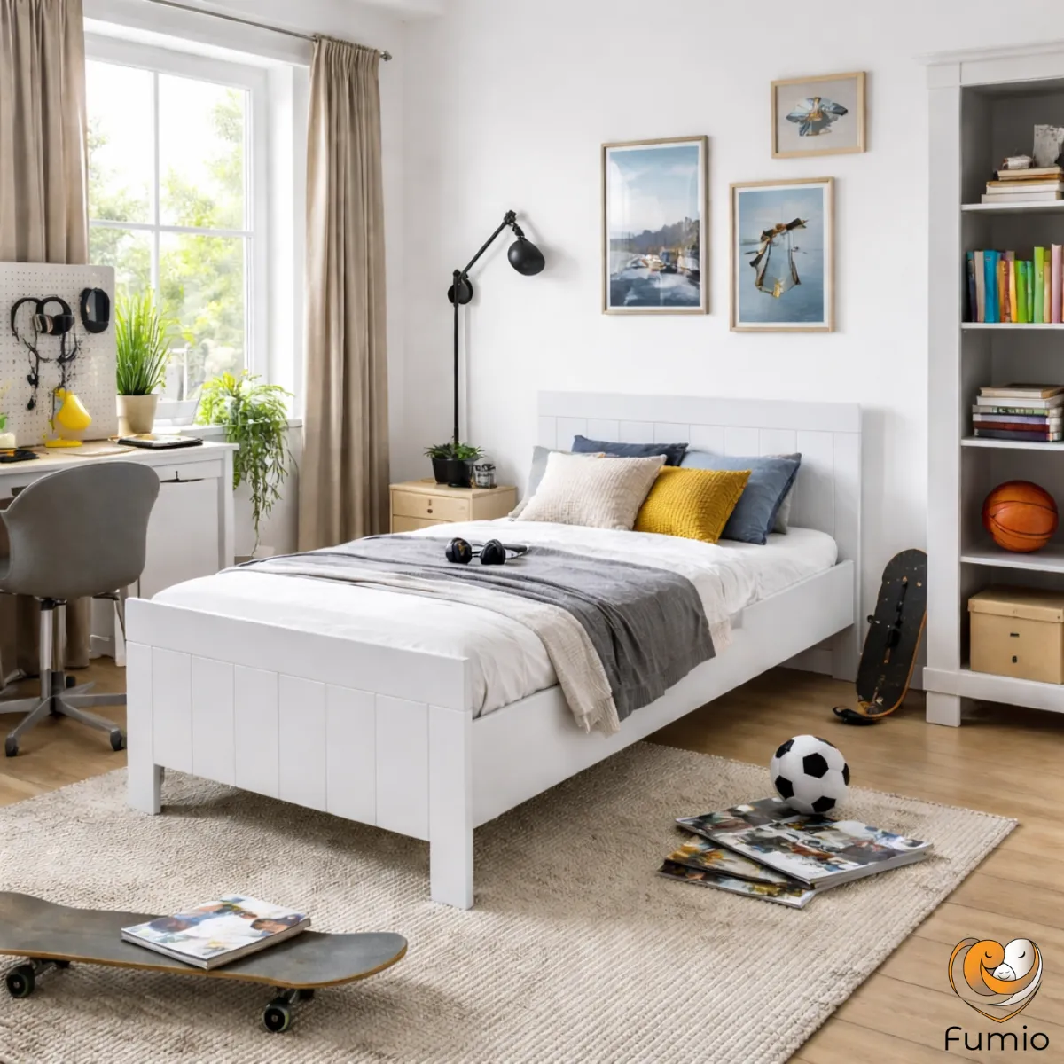 Łóżko świetnie komponuje się z innymi meblami z kolekcji Pinio Calmo białe, tworząc spójny zestaw do pokoju dziecka i nastolatka.