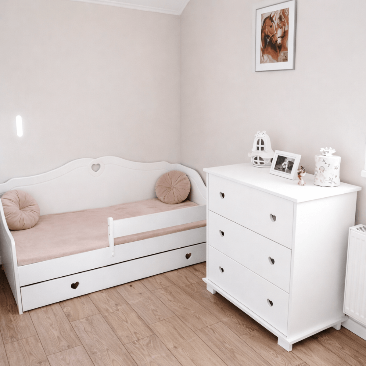 Łóżko-sofa HEART to wyjątkowe połączenie bajkowego designu, maksymalnego bezpieczeństwa i funkcjonalności. To idealne białe łóżko dla dziewczynki, które dzięki uroczym wycięciom w kształcie serduszek wprowadzi do pokoju dziecka magiczną, przytulną atmosferę.