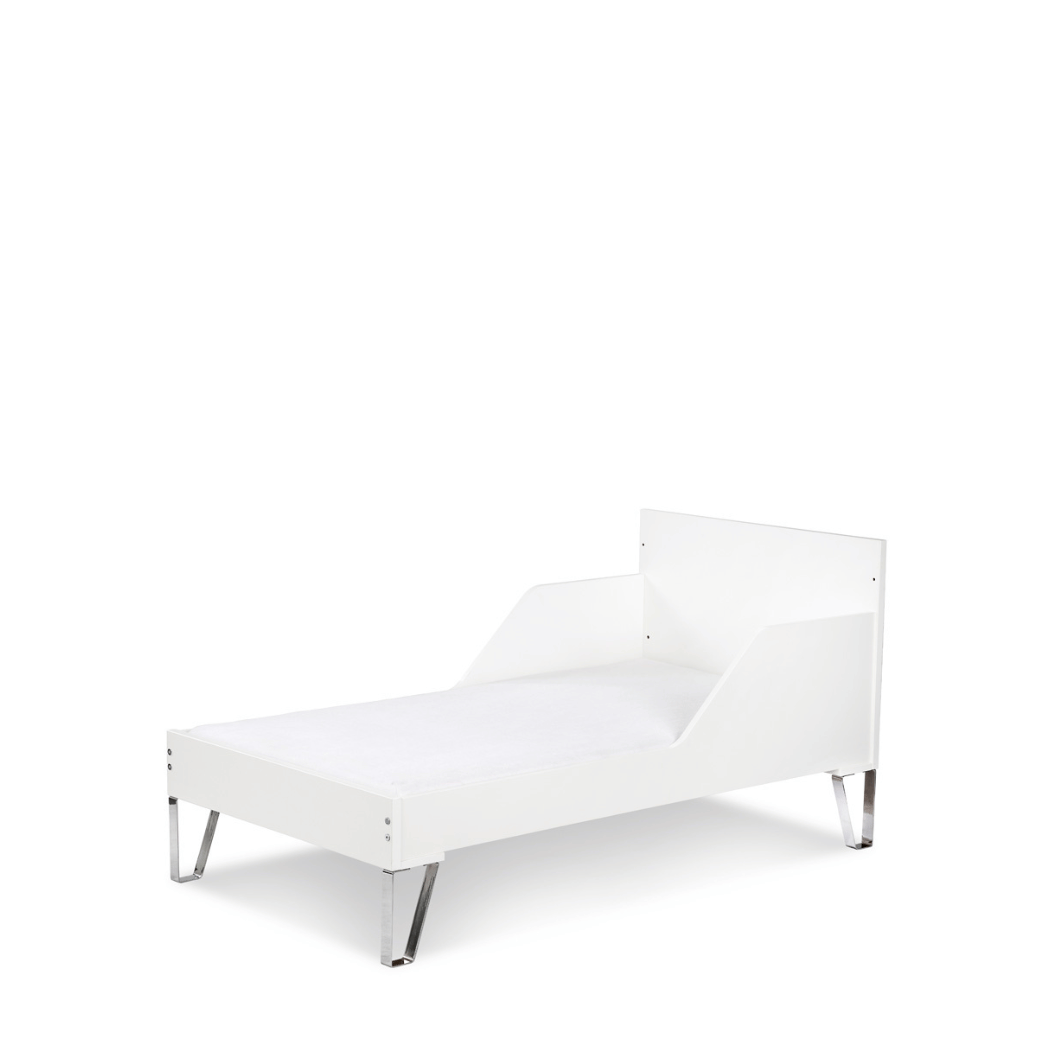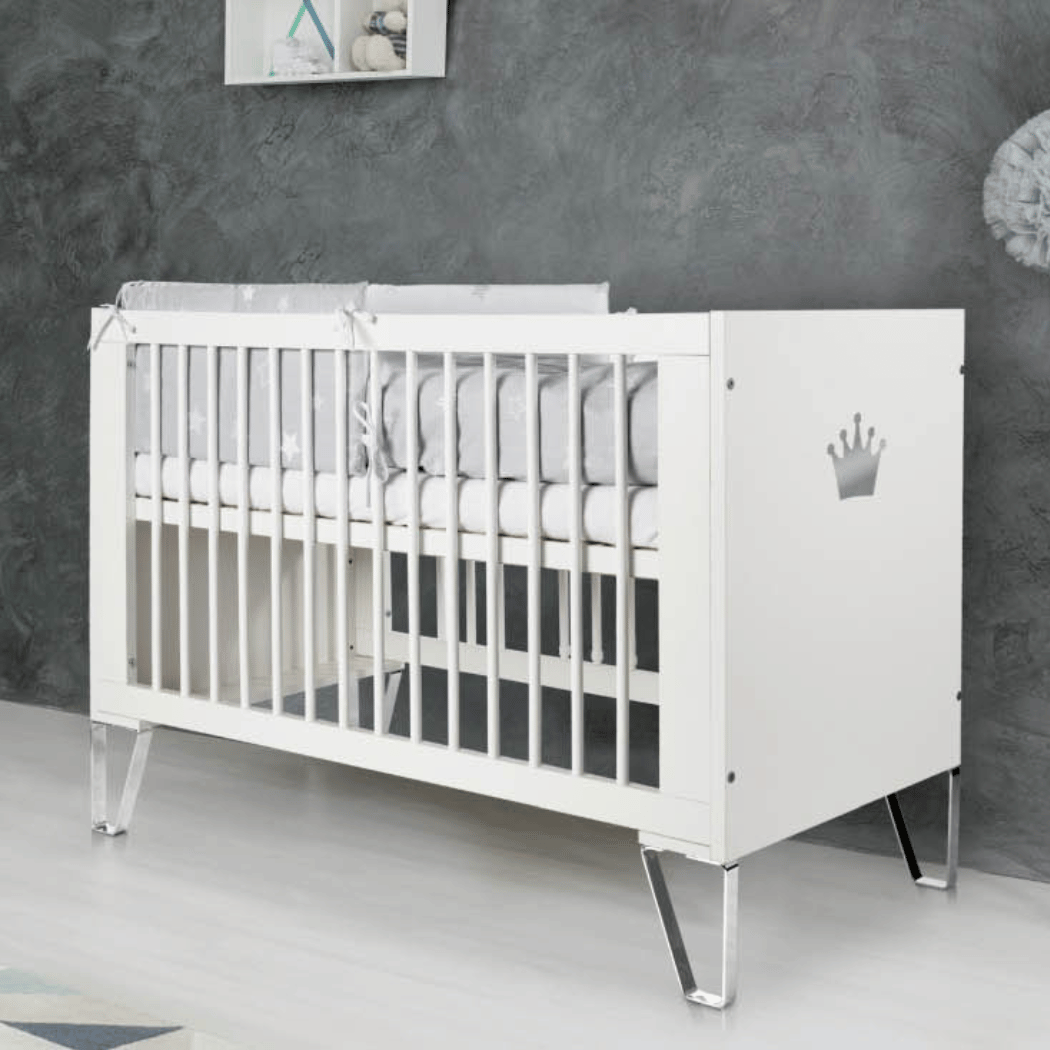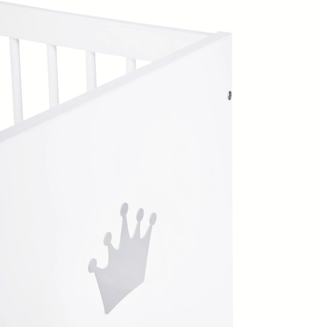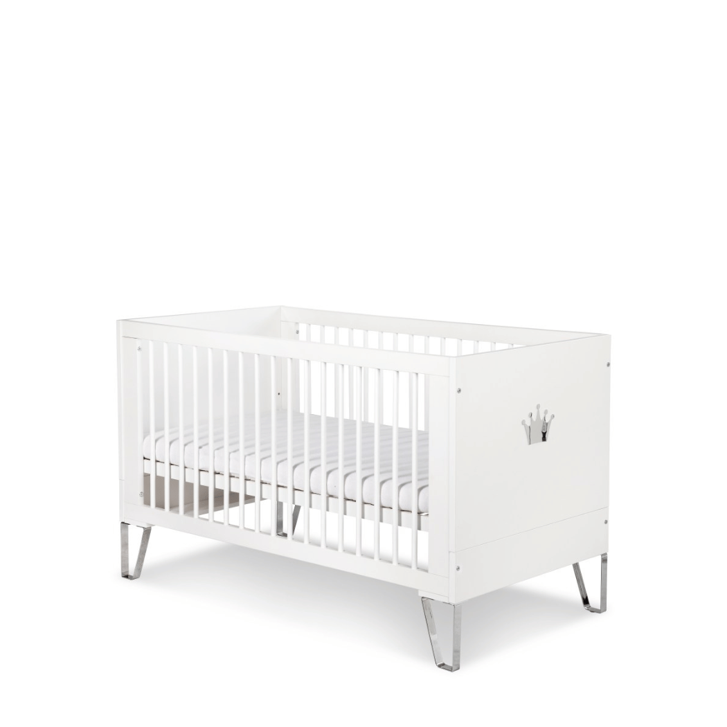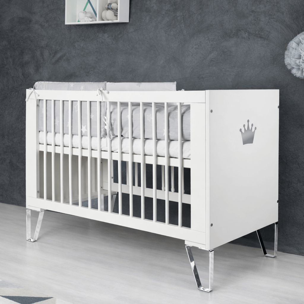 to wyjątkowy mebel, który łączy w sobie elegancję i funkcjonalność. Wykonane w eleganckiej bieli, łóżeczko wnosi do wnętrza świeżość i subtelny urok, doskonale komponując się z różnorodnymi aranżacjami pokoju dziecięcego. Wyróżniającym elementem jest lustrzana korona zdobiąca boczną ściankę, nadająca łóżeczku królewski charakter, który z pewnością przypadnie do gustu małym księżniczkom. Konstrukcja łóżeczka jest solidna i bezpieczna, z pionowymi szczebelkami po obu stronach, które zapewniają odpowiednią wentylację i jednocześnie chronią dziecko przed wypadnięciem. Łóżeczko jest umieszczone na stylowych, metalowych nóżkach, które dodają nowoczesnego akcentu i zapewniają stabilność mebla.