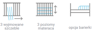 Dodatkowo, możecie dokupić barierkę do łóżeczka. Barierka ta przedłuża funkcjonalność łóżeczka i zapewnia bezpieczeństwo. Dzięki niej, spokojny sen ma wówczas nie tylko dziecko, ale i rodzic. Jest to idealne rozwiązanie dla rodziców, którzy chcą zapewnić swojemu dziecku maksymalne bezpieczeństwo podczas snu, jednocześnie zwiększając użyteczność mebla na dłuższy czas.
