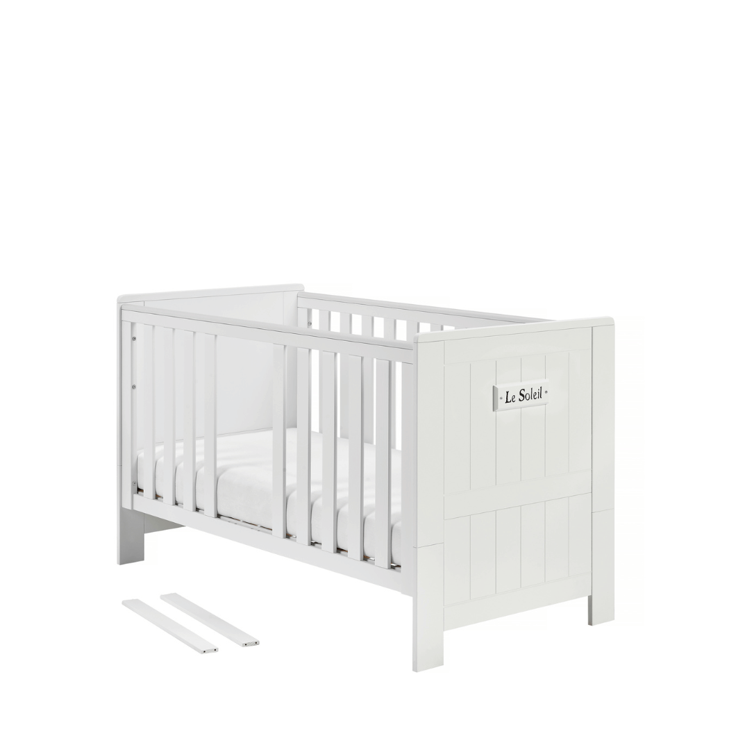 Stelaż pod materac jest zawsze dołączony, a do łóżeczka można dobrać również materac 140x70, praktyczną szufladę oraz małą barierkę zabezpieczającą. Dodatkowym atutem są boki zakończone plastikową nakładką, która pomaga zabezpieczyć elementy łóżeczka przed gryzieniem.