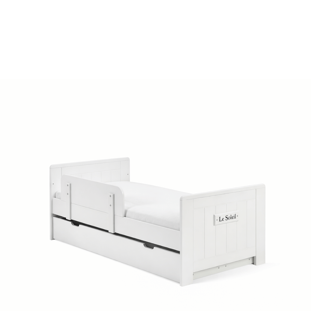 To białe łóżeczko tapczanik 140x70, które łączy bezpieczeństwo, wygodę użytkowania i subtelny styl kolekcji Marsylia.