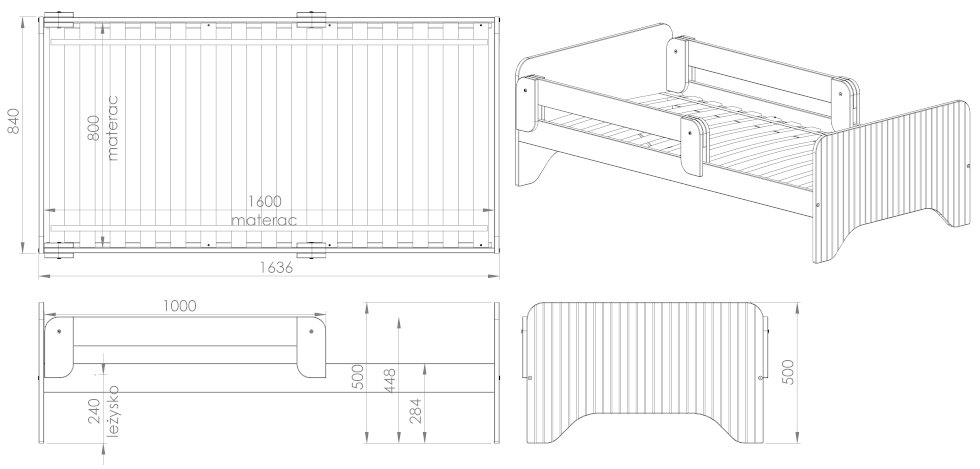Konstrukcja łóżka została wykonana z trwałych i bezpiecznych materiałów: szczyty z płyty MDF o grubości 18 mm zapewniają stabilność, zespolone listwy nośne (płyta wiórowa 104x18 oraz drewno 31x20) gwarantują solidne podparcie, a sprężynujące listwy dna ze sklejki 53x8 zwiększają komfort snu. Do łóżka pasuje materac o wymiarach 160x80 cm.