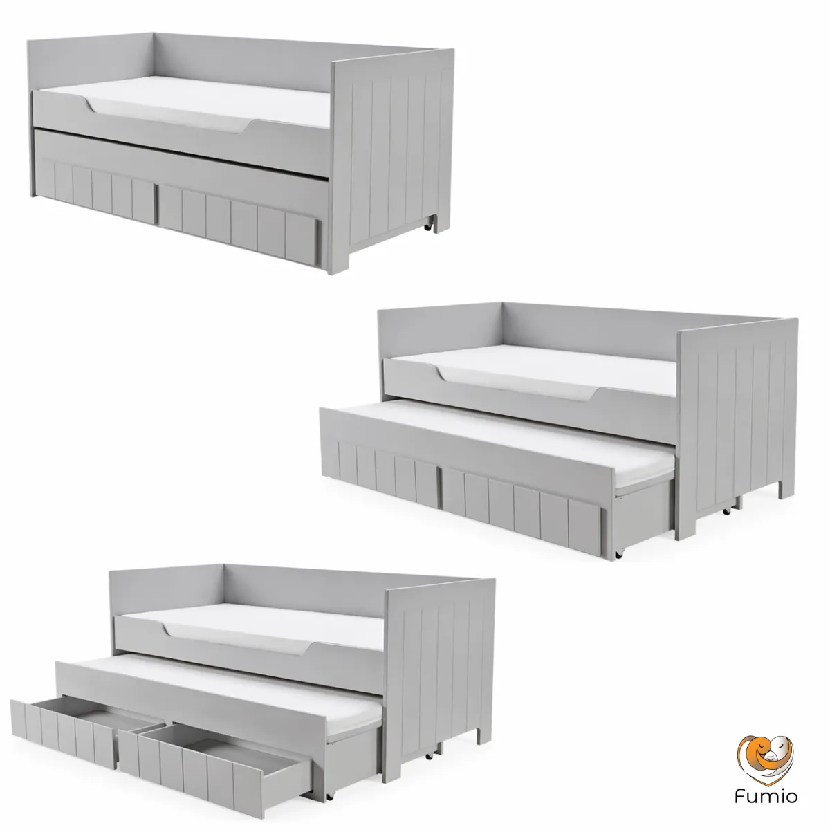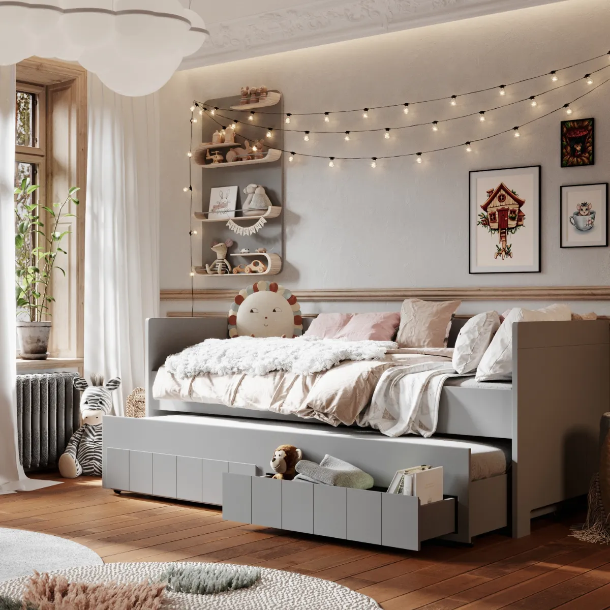 To funkcjonalne łóżko daybed, które łączy wygodną powierzchnię spania, dodatkowy wysuw i praktyczne miejsce do przechowywania.