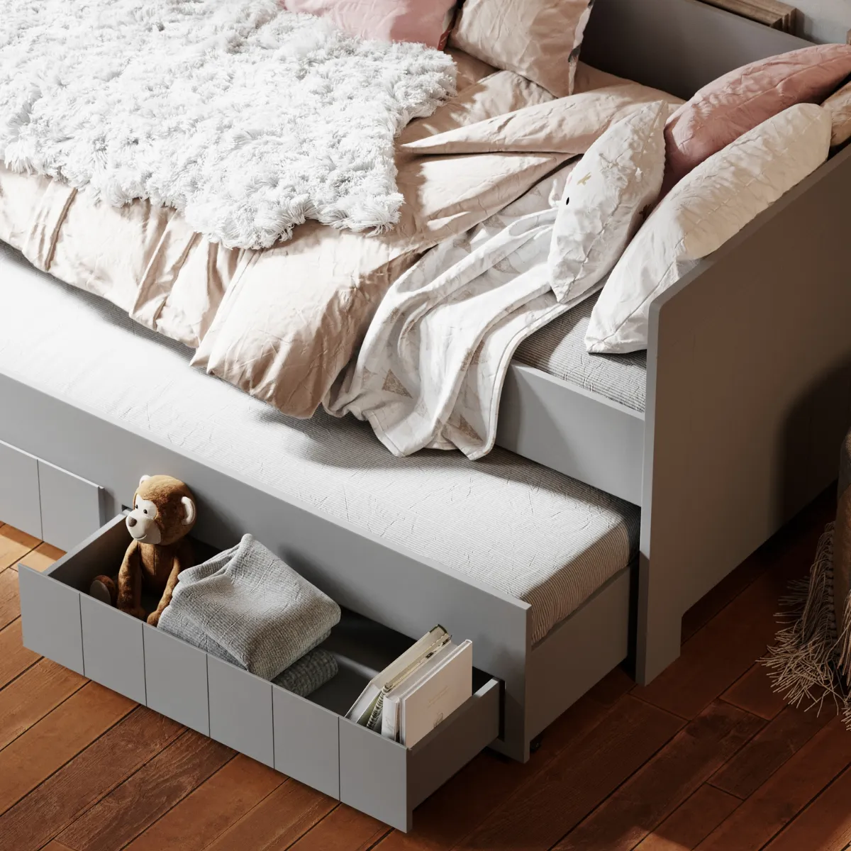 To szare łóżko z wysuwem, które łączy funkcję drugiego spania, praktyczne przechowywanie i ponadczasowy wygląd kolekcji Calmo.