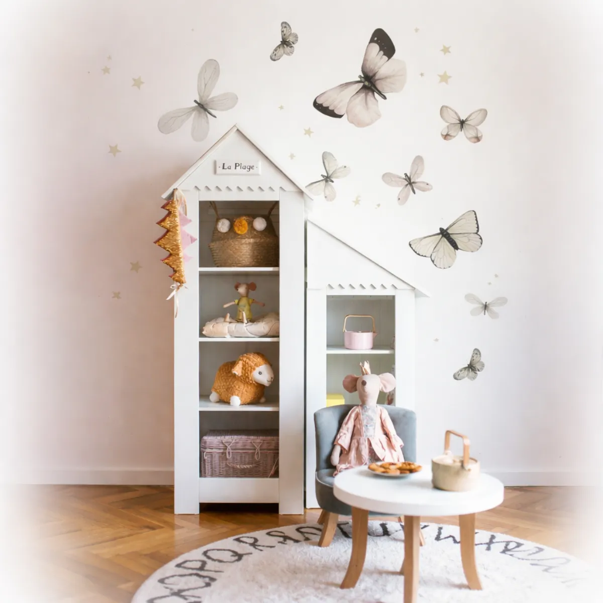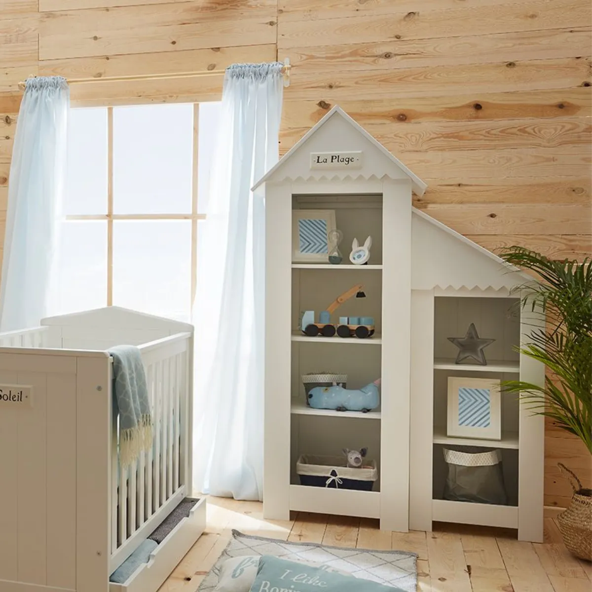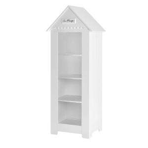 Model został zaprojektowany z myślą o estetyce i codziennym komforcie użytkowania. Białe wykończenie, delikatne detale i charakterystyczny dach inspirowany domkiem plażowym sprawiają, że regał dobrze wpisuje się w spokojne aranżacje pokoju dziecka i świetnie komponuje się z innymi meblami z kolekcji Pinio Marsylia.