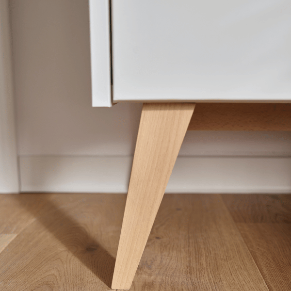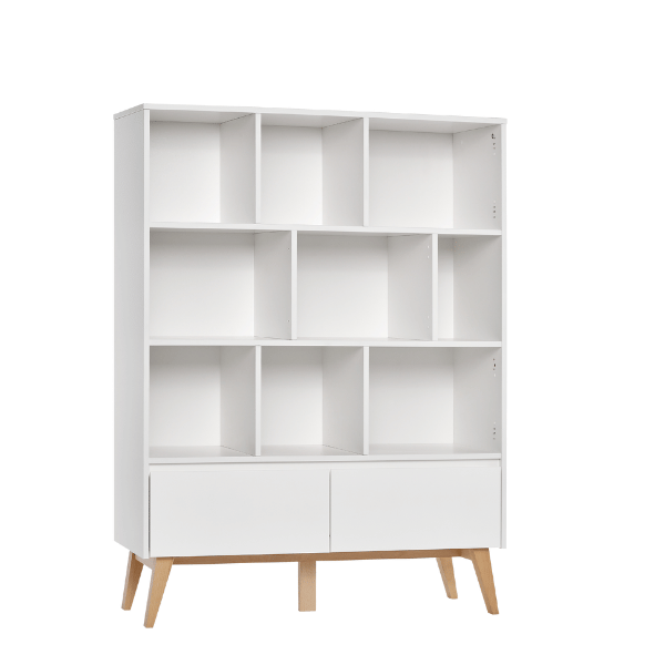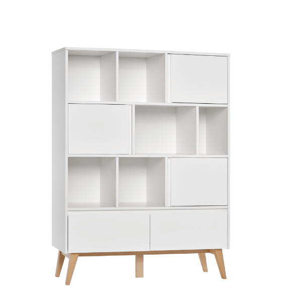 Jasna kolorystyka i drewniane nóżki nadają wnętrzu lekkości, a jednocześnie ułatwiają dopasowanie regału do innych mebli w pokoju niemowlaka, przedszkolaka lub starszego dziecka. Regał świetnie komponuje się z meblami z kolekcji PINIO SWING białe.