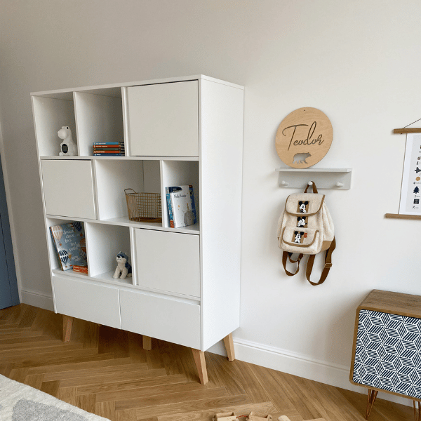 Regał został zaprojektowany z myślą o wygodzie użytkowania i dobrze uporządkowanej przestrzeni w pokoju dziecka.