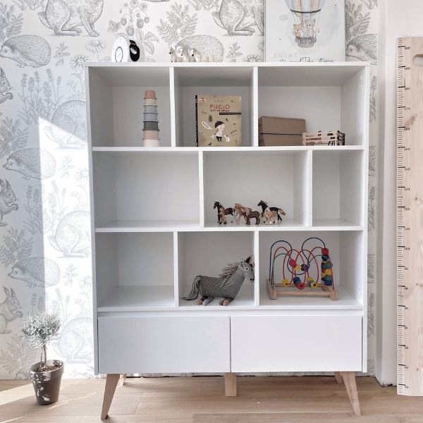 Tak, to bardzo praktyczny regał do pokoju malucha – półki pomagają uporządkować książeczki, zabawki i pudełka, a szuflady pozwalają schować drobniejsze rzeczy.