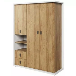 Szafa wykonana z płyty laminowanej z obrzeżami wzmocnionymi ABS. Wewnątrz znajdują się 3 półki, drążek na wieszaki oraz dwie wnęki, które z powodzeniem ułatwią przechowywanie pokaźnej ilości garderoby, obuwia oraz torebek i plecaków. Dodatkowe miejsce do przechowywania znajduje się na półce nad drążkiem. Mebel wyposażono również w dwie szuflady, przydatne np. do przechowywania bielizny. Dno szafy można z powodzeniem wykorzystać do przechowywania pudełek z butami, walizek lub mniejszych sprzętów sportowych. Ponadczasowe zestawienie bieli i dekoru o ciepłej barwie drewna sprawia, że szafa stworzy przytulną aranżację w każdym wnętrzu.