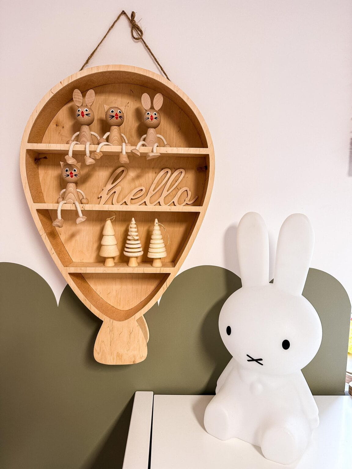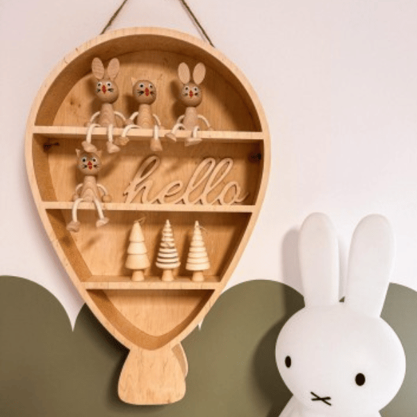 Półka jest wyposażona w sznurek do zawieszenia, co umożliwia łatwy i bezpieczny montaż na ścianie. Jej elegancki i minimalistyczny design sprawia, że doskonale wpasuje się zarówno do pokoju dziecięcego, jak i do salonu, dodając wnętrzu naturalnego uroku i ciepła.
