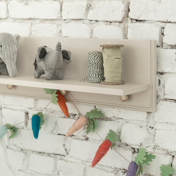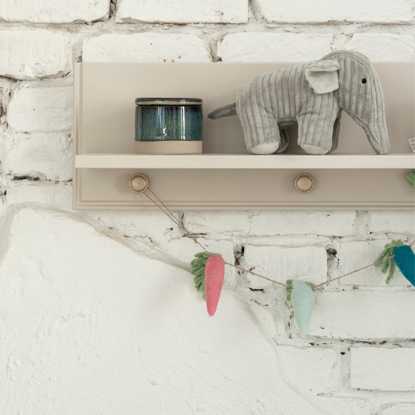 Stonowany odcień beżu, prosta forma i drewniane elementy sprawiają, że półka wygląda lekko i nowocześnie. Dobrze pasuje zarówno do pokoju malucha, jak i starszego dziecka czy nastolatka, dlatego nie traci sensu wraz ze zmianą aranżacji wnętrza.