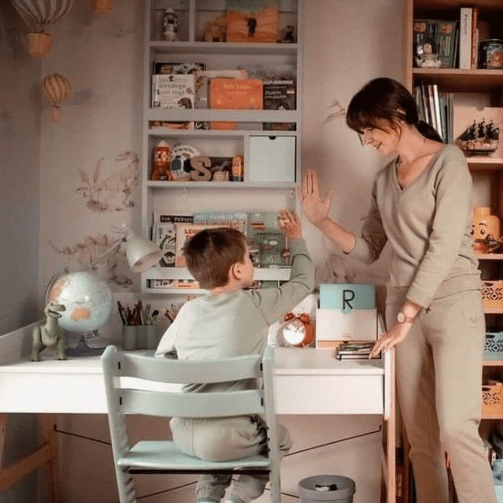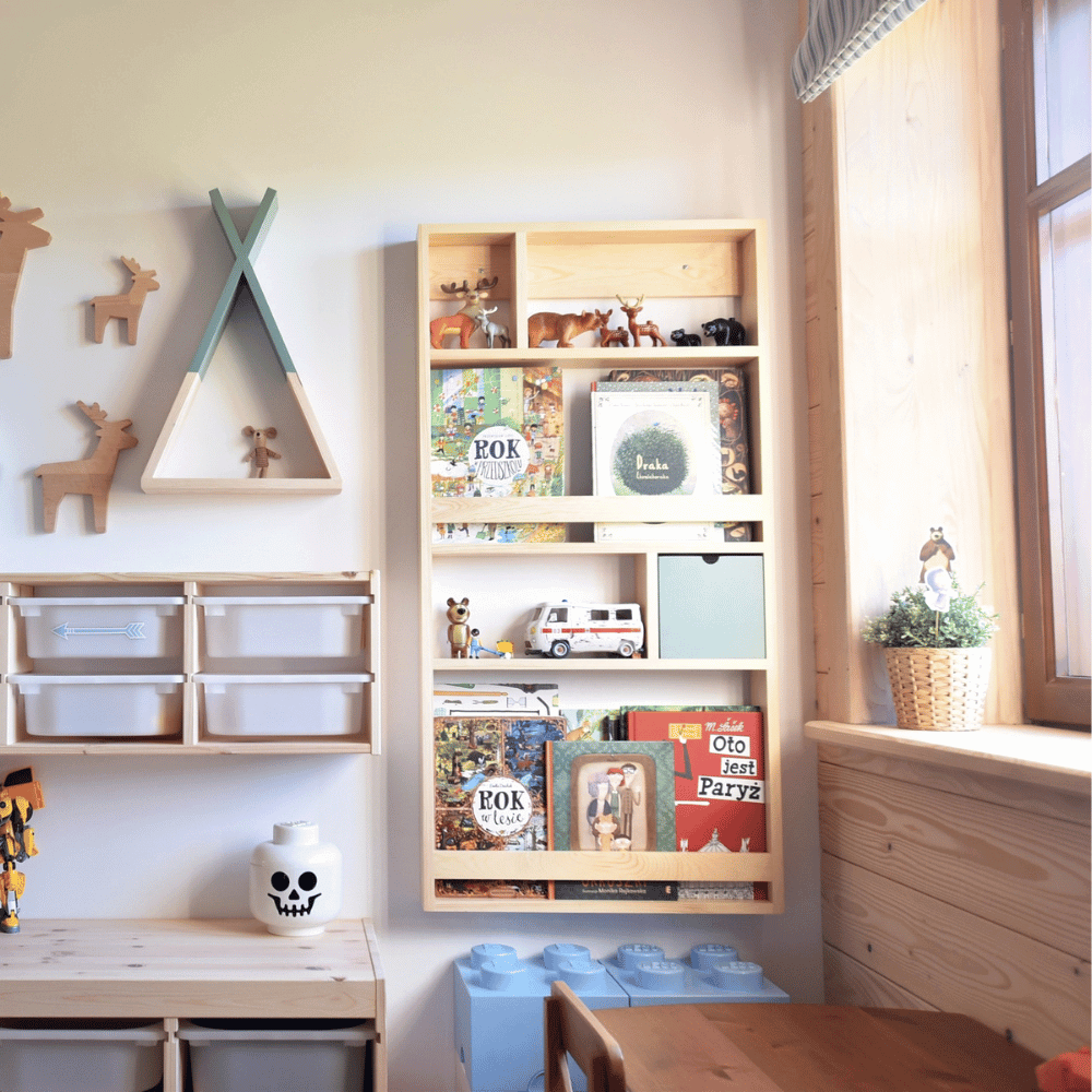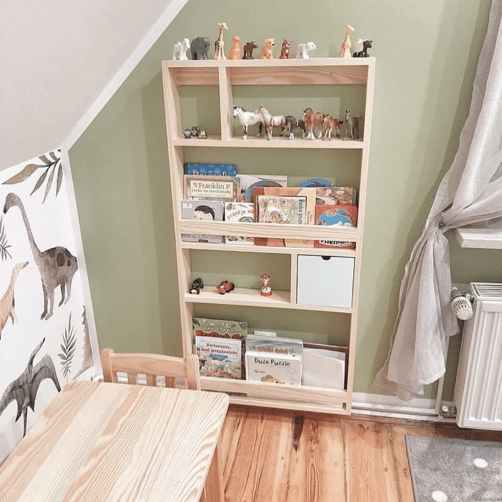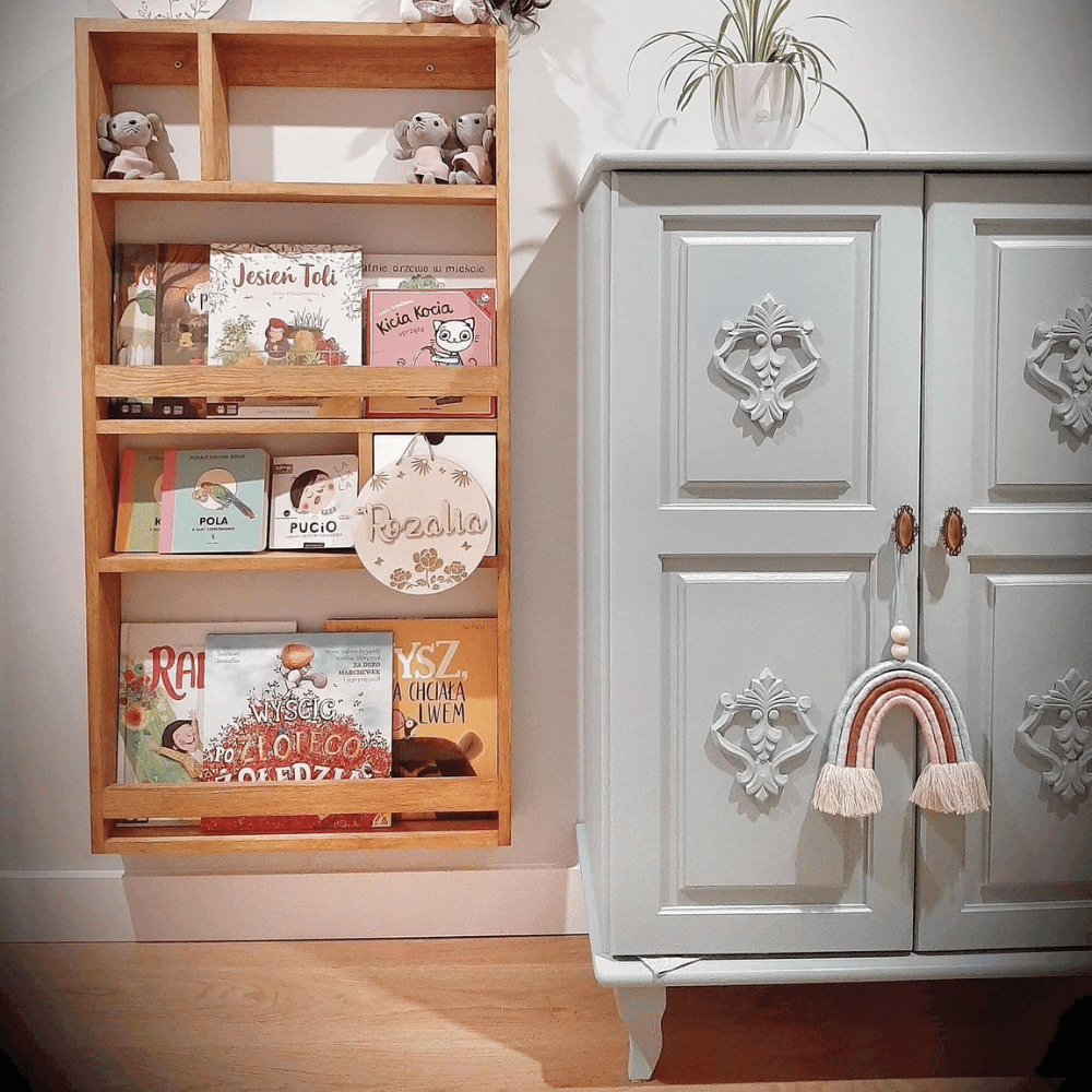 Praktyczne listewki zabezpieczające sprawiają, że książki pozostają stabilne i nie przewracają się, co ułatwia utrzymanie porządku i pozwala dziecku samodzielnie sięgać po ulubione historie. Odpowiednio zaprojektowana wysokość półek umożliwia przechowywanie zarówno większych albumów i książek obrazkowych, jak i mniejszych pozycji. Dzięki temu biblioteczka jest bardzo uniwersalna i może służyć dziecku przez wiele lat.