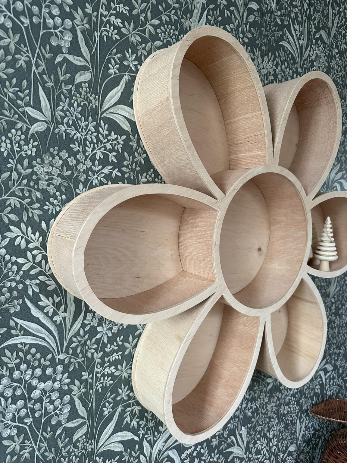 Ta urocza półka w kształcie kwiatu wykonana jest z wysokiej jakości sklejki brzozowej, co zapewnia jej trwałość i estetyczny wygląd. Półka składa się z centralnej okrągłej komory otoczonej sześcioma owalnymi przegródkami, które razem tworzą kształt kwiatu. Każda z przegródek jest idealna do przechowywania małych zabawek, książek, czy innych dziecięcych skarbów.