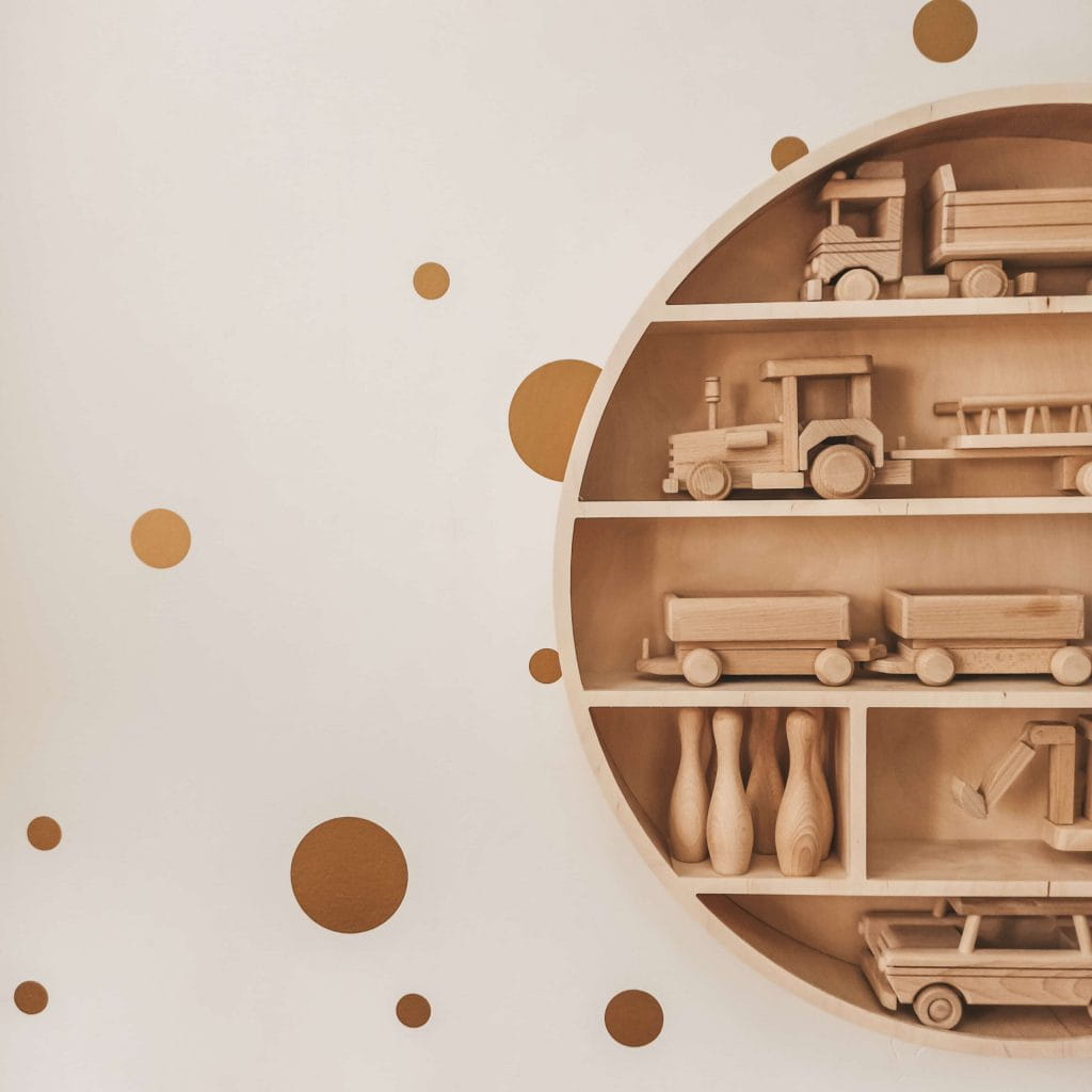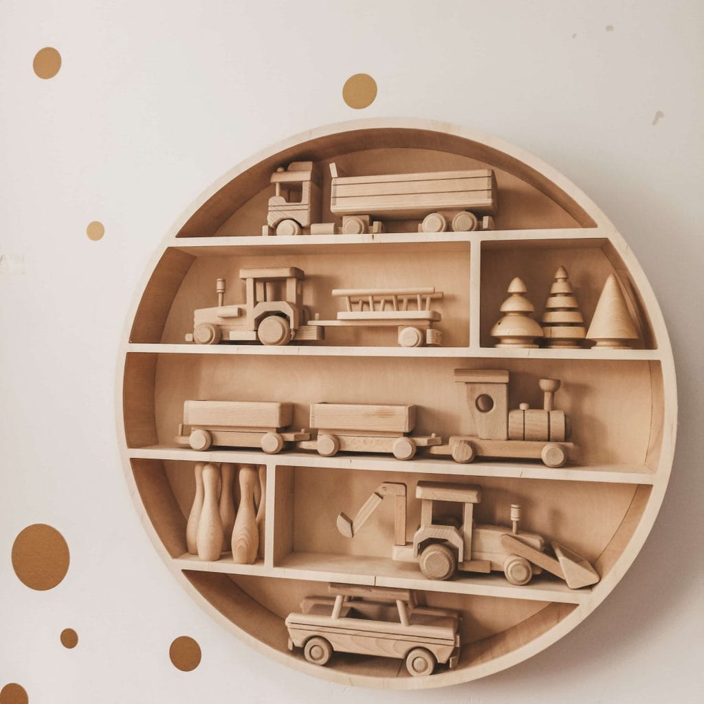 Półka wyposażona jest w system mocowania do ściany, co gwarantuje łatwy i bezpieczny montaż. Jej minimalistyczny design sprawia, że doskonale wpasuje się zarówno do pokoju dziecięcego, jak i do salonu, dodając wnętrzu naturalnego uroku i ciepła.