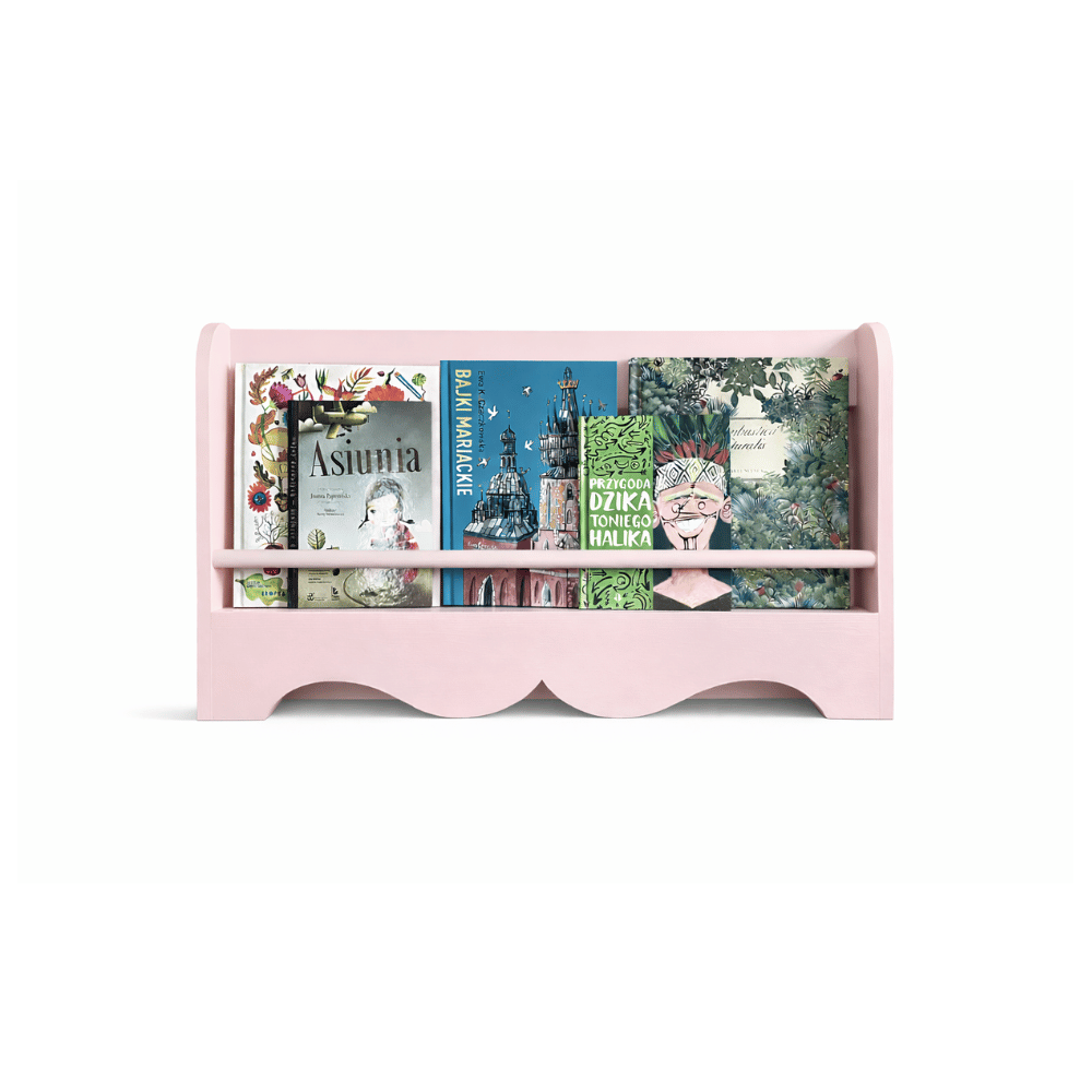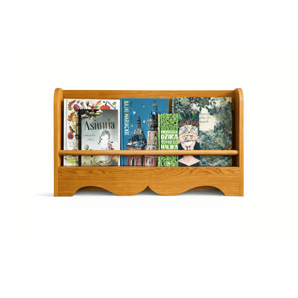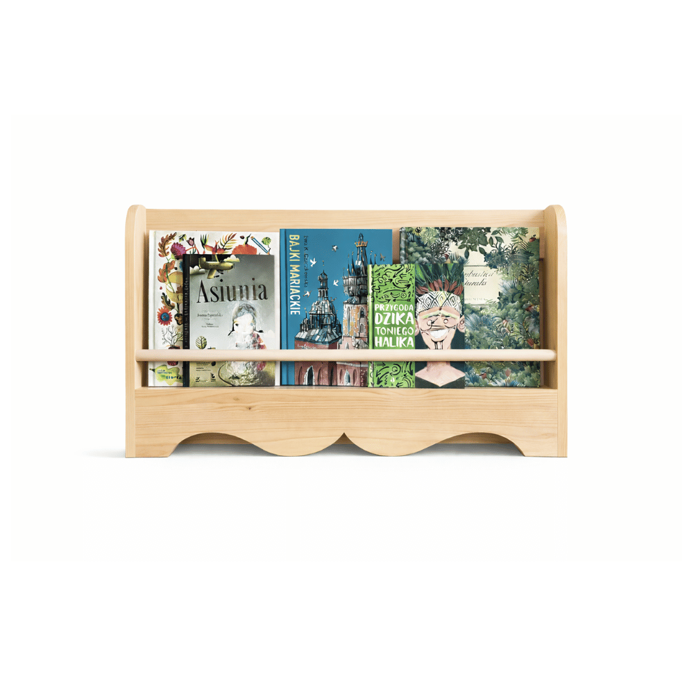Półka została wykonana w całości z naturalnego drewna sosnowego, co zapewnia trwałość oraz naturalny wygląd. Charakterystyczny rustykalny detal w dolnej części nadaje jej lekkości i sprawia, że półka dobrze komponuje się z różnymi aranżacjami wnętrz – od skandynawskich po klasyczne pokoje dziecięce. Konstrukcja umożliwia ustawienie książek okładką do przodu, dzięki czemu dziecko łatwiej wybiera swoje ulubione tytuły.
