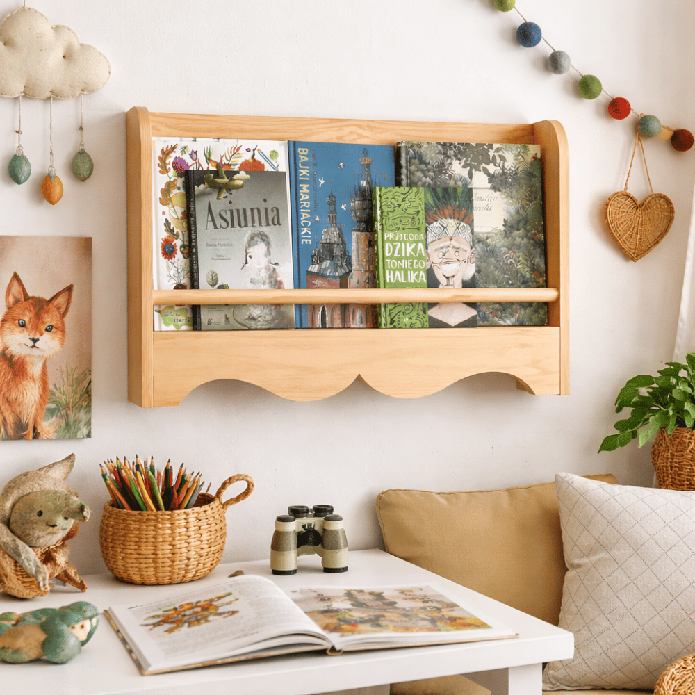 Rustykalna półka ścienna to praktyczne i estetyczne rozwiązanie do przechowywania książek, dekoracji lub drobnych przedmiotów w pokoju dziecka. Dzięki prostej, ponadczasowej formie doskonale uzupełnia biblioteczkę stojącą i pozwala stworzyć spójny kącik do czytania. To mniejsza wersja biblioteczki, którą można wygodnie zawiesić na ścianie w pokoju dziecka, sypialni lub nawet w kuchni.