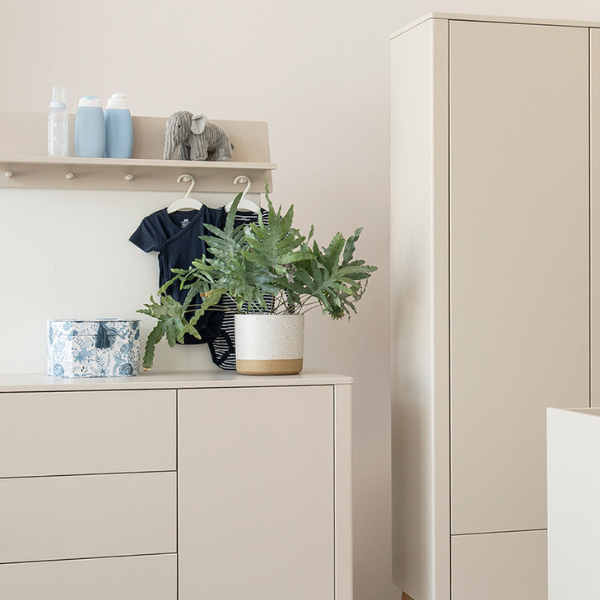 Model został wyposażony w praktyczną półkę ścienną oraz drewniane wieszaki, dzięki czemu świetnie sprawdza się do przechowywania kosmetyków, akcesoriów niemowlęcych, książeczek, dekoracji i wszystkich codziennych drobiazgów potrzebnych w pokoju dziecka.