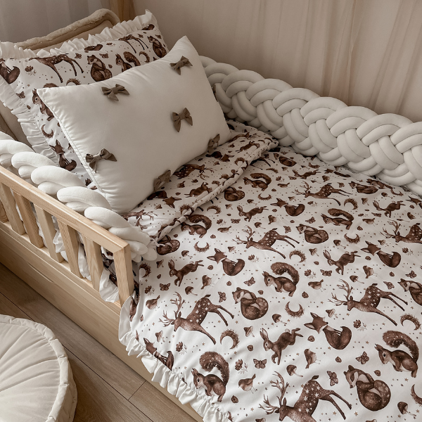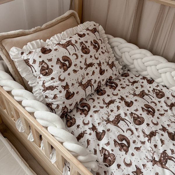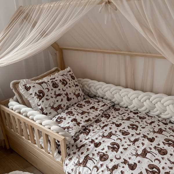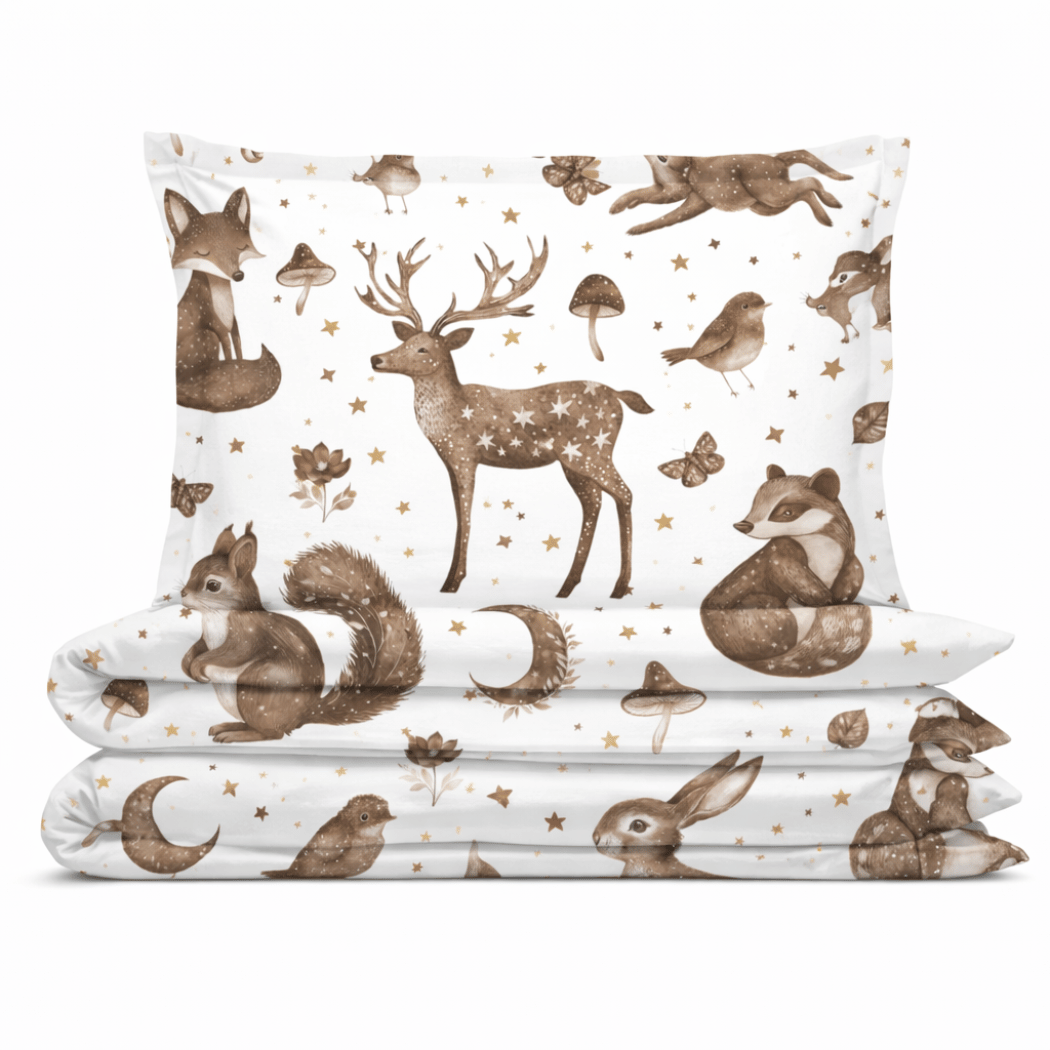 Pościel bawełniana Gwiezdny Las to wyjątkowa propozycja dla dzieci, które kochają naturę, zwierzątka i spokojne, przytulne wnętrza. Delikatny, leśny wzór z wiewiórkami, jelonkami, zajączkami i sowami przenosi malucha do świata cichych, nocnych opowieści, gdzie sen przychodzi łatwo i spokojnie. Stonowana paleta barw w ciepłych odcieniach beżu i brązu wprowadza harmonię oraz sprzyja wyciszeniu przed snem, tworząc bezpieczną i kojącą atmosferę w dziecięcym pokoju.