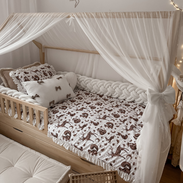 Model Gwiezdny Las dostępny jest w trzech wariantach wykończenia. Romantyczna falbanka doda aranżacji lekkości i uroku, klasyczny rant podkreśli ponadczasowy styl, a dekoracyjne kokardki wprowadzą subtelny, bajkowy akcent. Każda wersja została starannie odszyta z dbałością o detale, trwałość i bezpieczeństwo użytkowania.