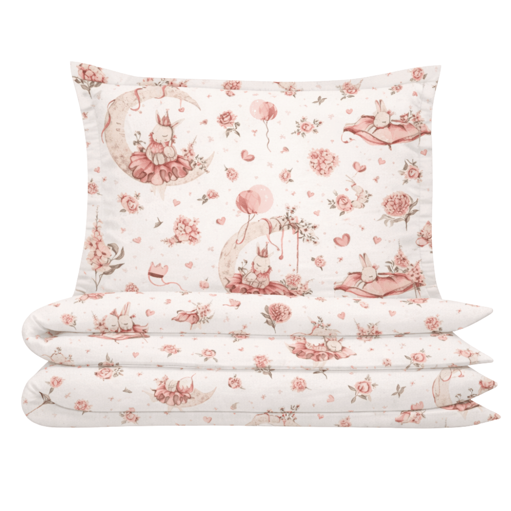 Pościel dziecięca inspirowana bajkowym światem baletnic i delikatnych kwiatów to propozycja stworzona z myślą o małych marzycielkach. Subtelny wzór w odcieniach pudrowego różu i beżu wprowadza do pokoju dziecka atmosferę ciepła, spokoju i elegancji, sprzyjając wyciszeniu oraz spokojnemu zasypianiu. Motyw baletnic, kwiatów i drobnych serduszek pobudza wyobraźnię i zamienia codzienny sen w wyjątkową, pełną uroku opowieść.