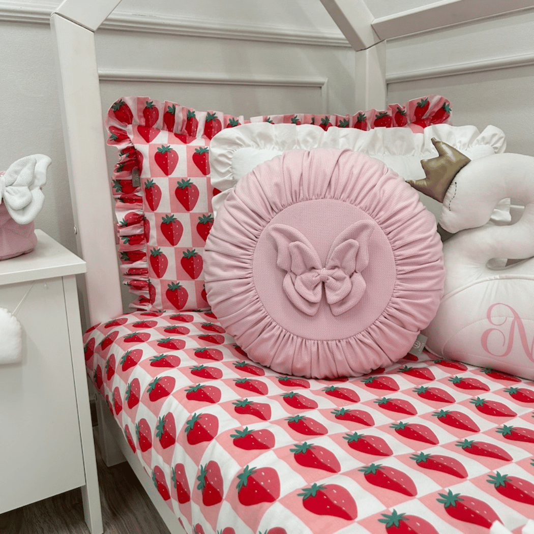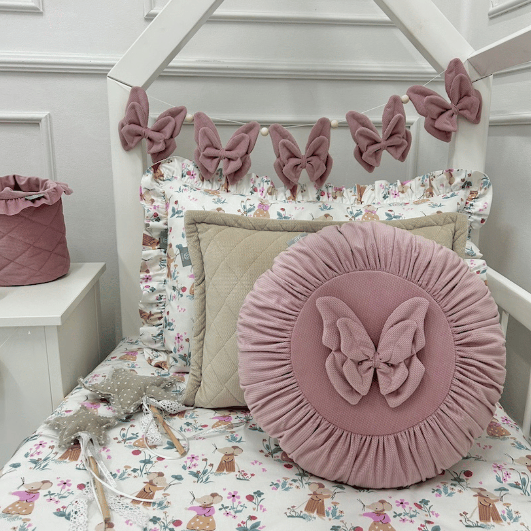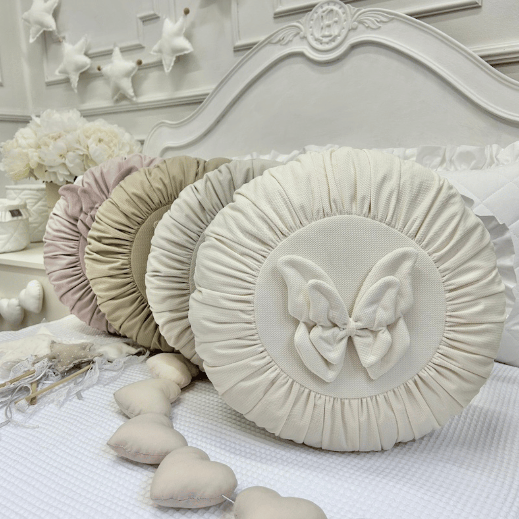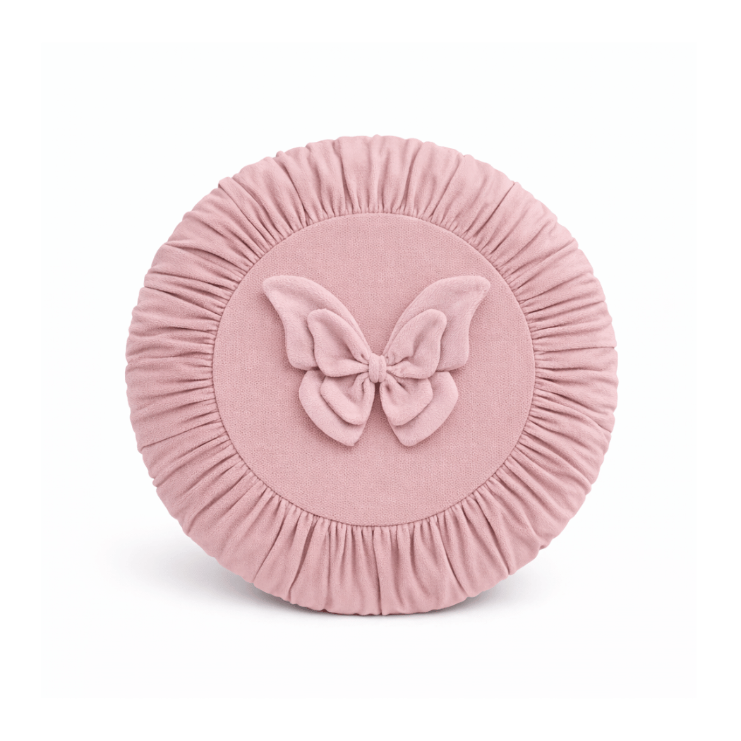 Okrągła forma poduszki została wykończona efektownym marszczeniem dookoła, które nadaje jej romantycznego i przytulnego charakteru. Centralnym elementem dekoracyjnym jest podwójny motylek, starannie uszyty z tego samego materiału, który przyciąga wzrok i dodaje całości wyjątkowej lekkości oraz dziewczęcego uroku. Każdy detal został dopracowany z myślą o estetyce i harmonii.