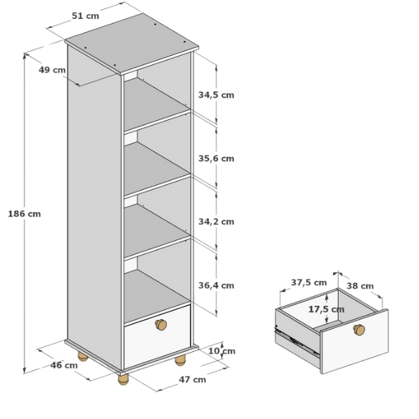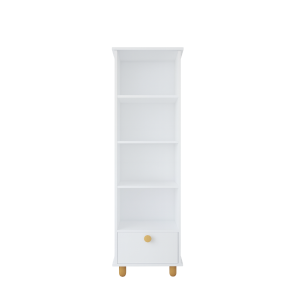 Cztery otwarte, wygodne półki zachęcają do tworzenia małych ekspozycji ulubionych książeczek, pluszaków czy dekoracji. Dzięki temu wszystkie ważne skarby są zawsze pod ręką, a jednocześnie prezentują się estetycznie i zachęcają dziecko do samodzielności.