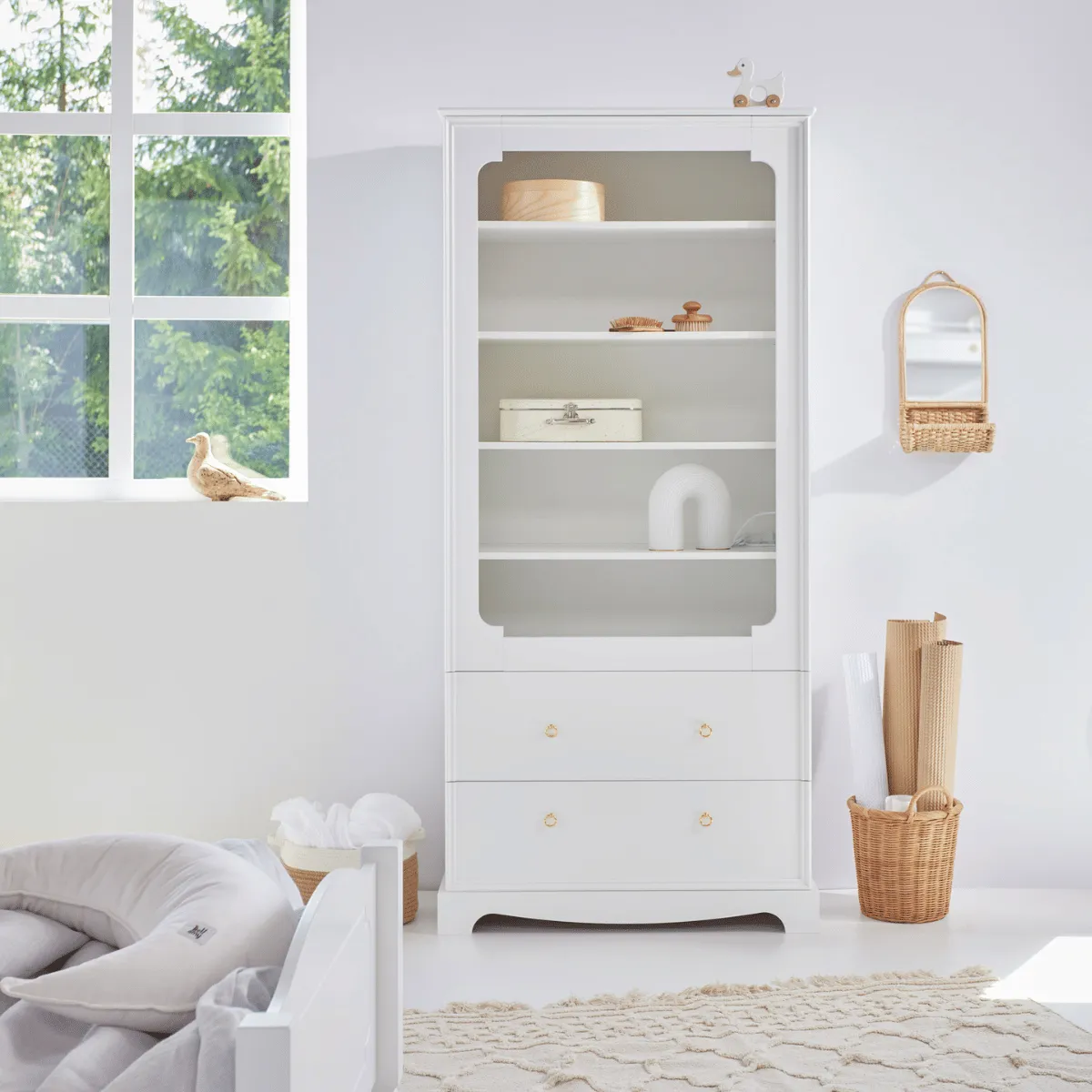Biały kolor mebla i dekoracyjne złote uchwyty nadają regałowi elegancki, szlachetny wygląd, który doskonale pasuje do klasycznych i stylowych aranżacji pokoju dziecka.