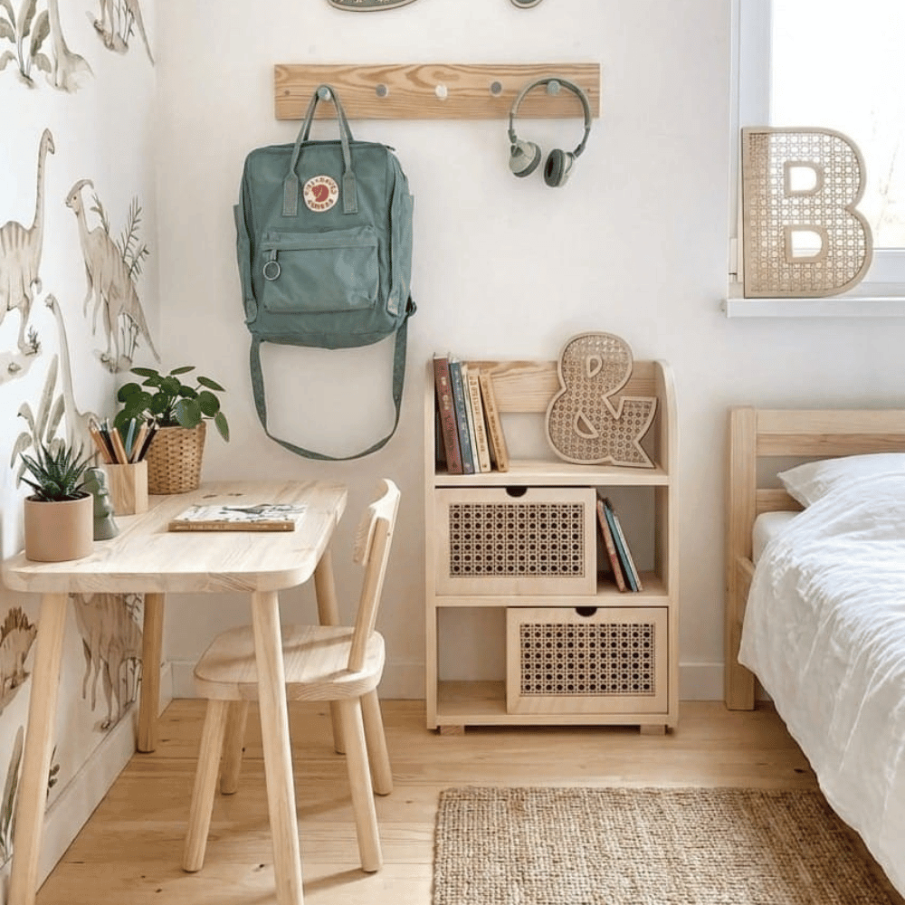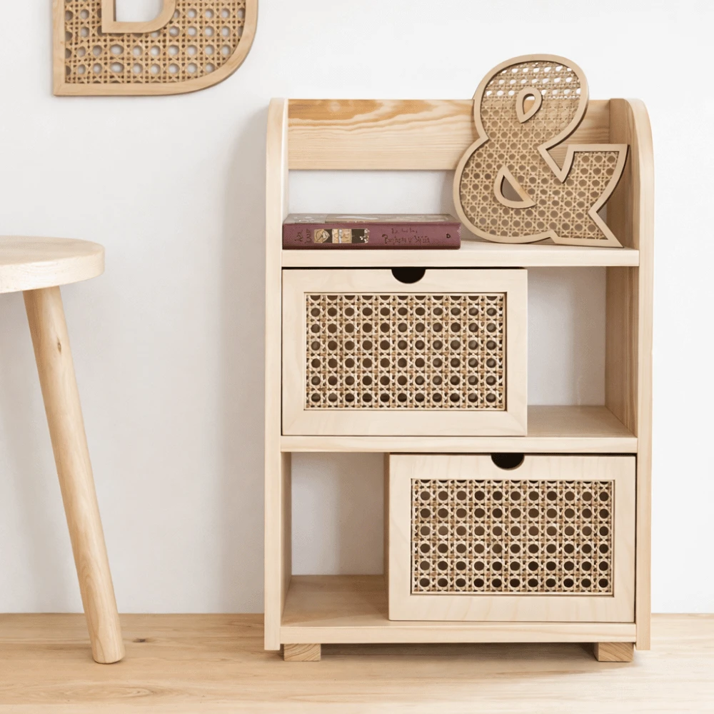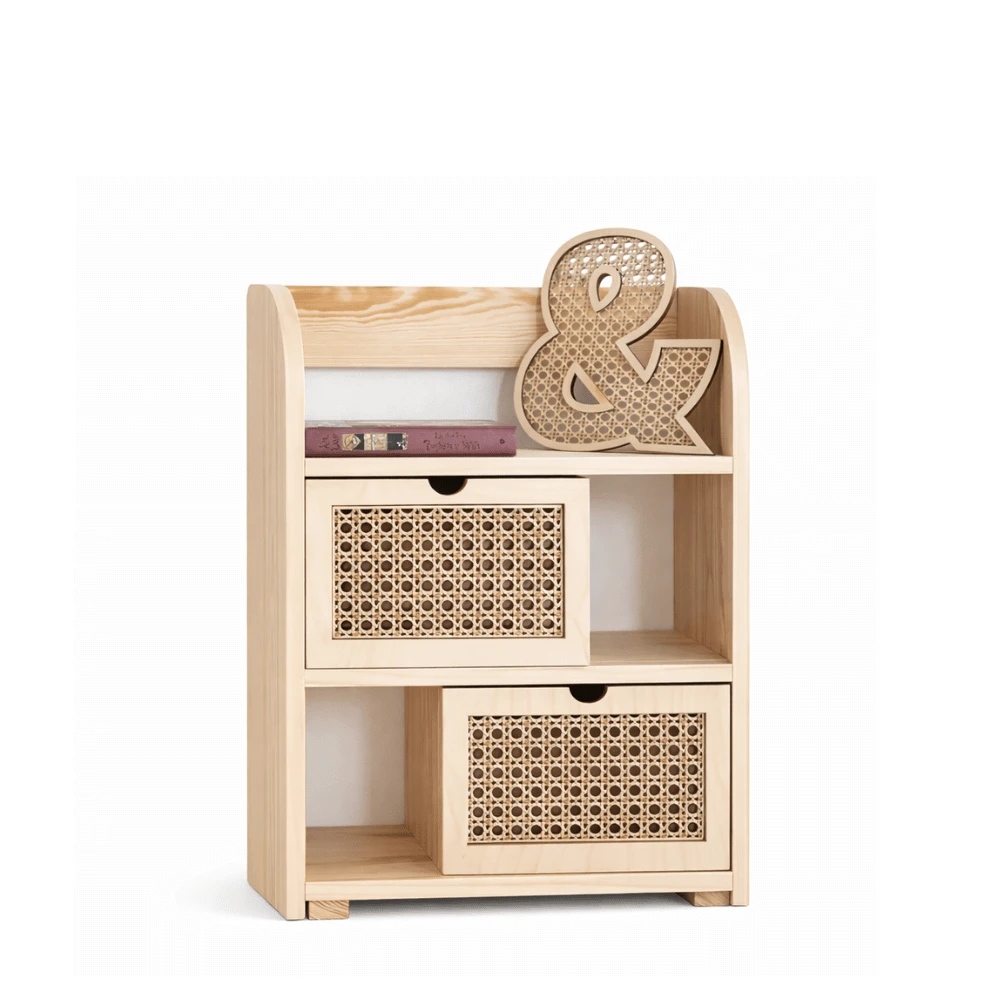 Odkryj wszechstronność i elegancję drewnianego regału biblioteczki z ratanem! Idealny na drobne bibeloty, a może jako szafka nocna? Ten regał doskonale odnajdzie się w wielu rolach, dostosowując się do potrzeb Twojego malucha.