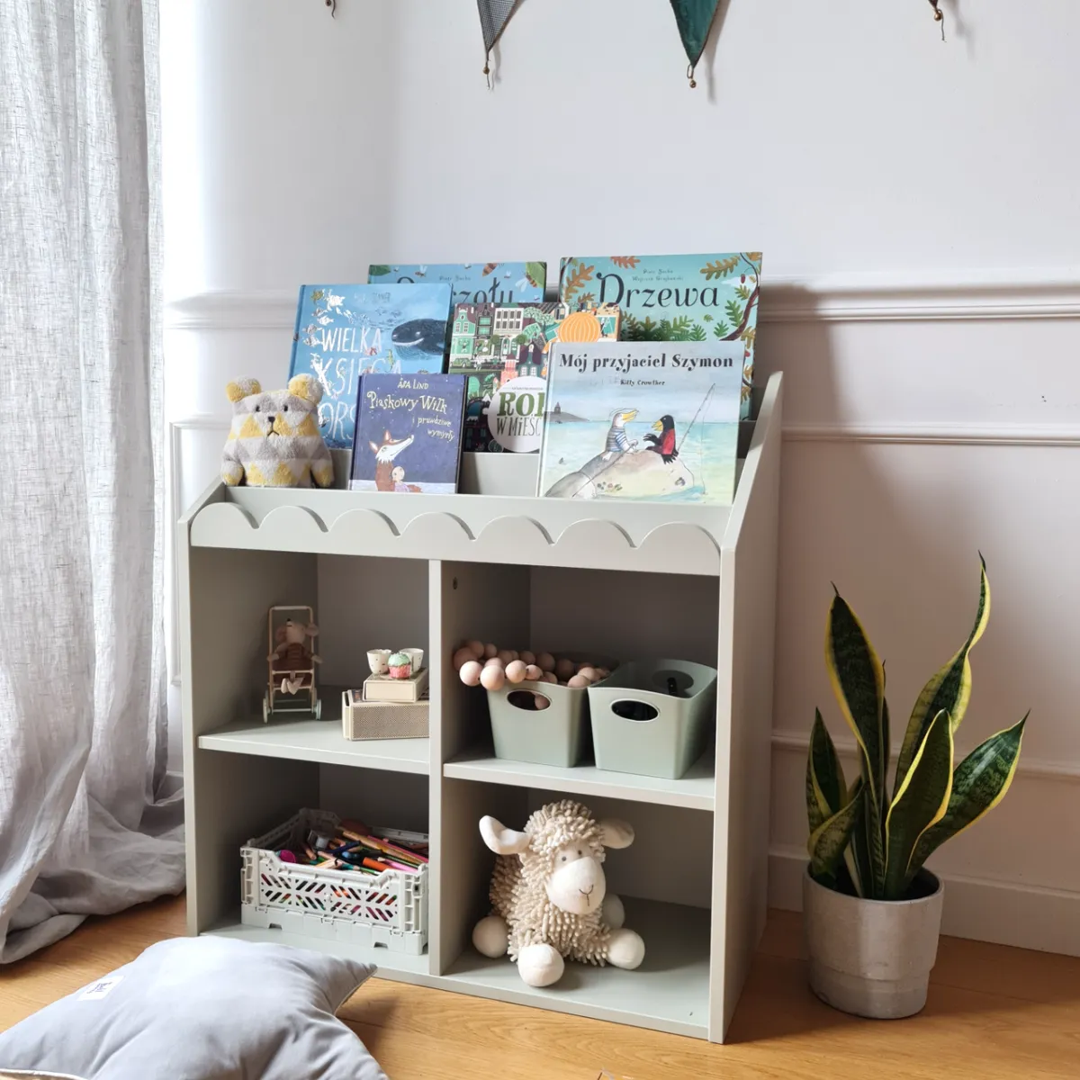 Bellamy Book Nook Sage świetnie sprawdza się jako regał Montessori na książki, regał dziecięcy na zabawki oraz biblioteczka do pokoju dziecka.