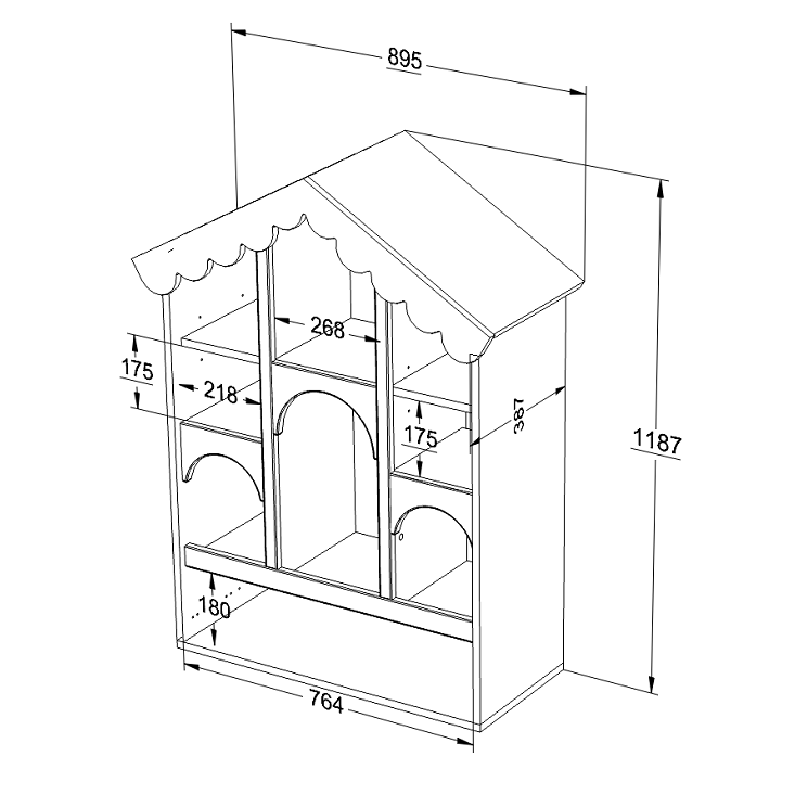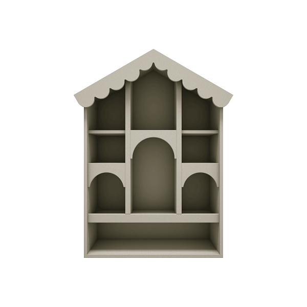 Wyjątkowy regał w kształcie domku to idealne rozwiązanie 2w1 – może pełnić funkcję zarówno regału na książki i zabawki, jak i domku dla lalek, tworząc przestrzeń do kreatywnej zabawy. Dzięki przemyślanemu układowi półek pozwala na łatwą organizację i przechowywanie ulubionych przedmiotów dziecka. Dekoracyjne wykończenia, takie jak falbankowy dach i łukowe przejścia, nadają mu wyjątkowy, bajkowy charakter.