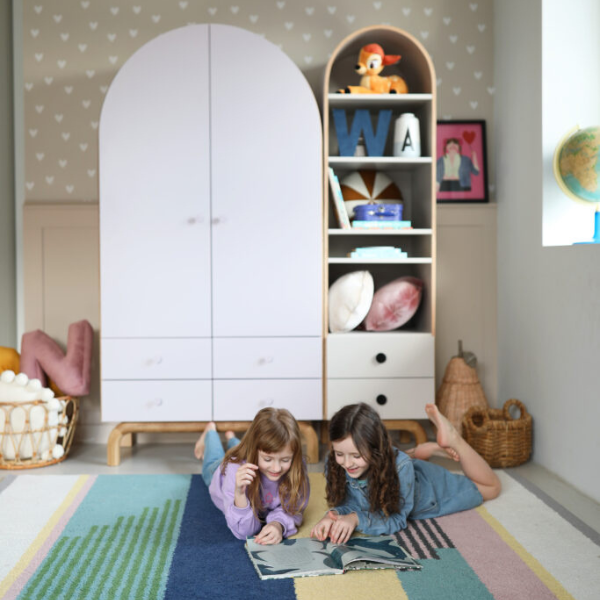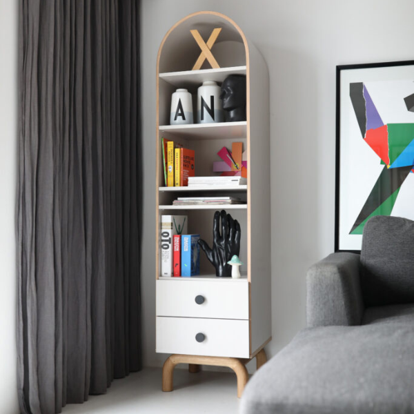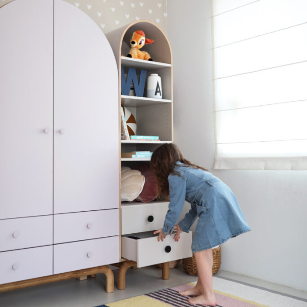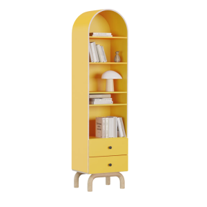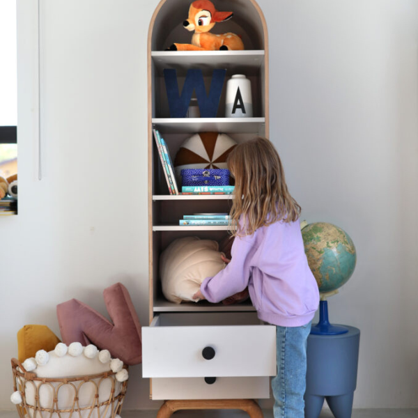 Stylowe łuki i inspiracja estetyką mid-century modern nadają mu lekkości i subtelnego uroku, który będzie pasować zarówno do barwnego pokoju dziecka, jak i bardziej stonowanego wnętrza nastolatka. Regał wyposażony został w dwie pojemne szuflady, idealne do przechowywania przyborów szkolnych, drobnych zabawek, dokumentów czy osobistych skarbów. T
