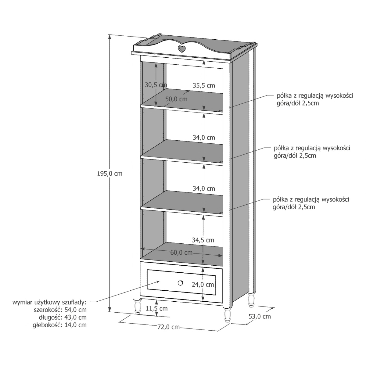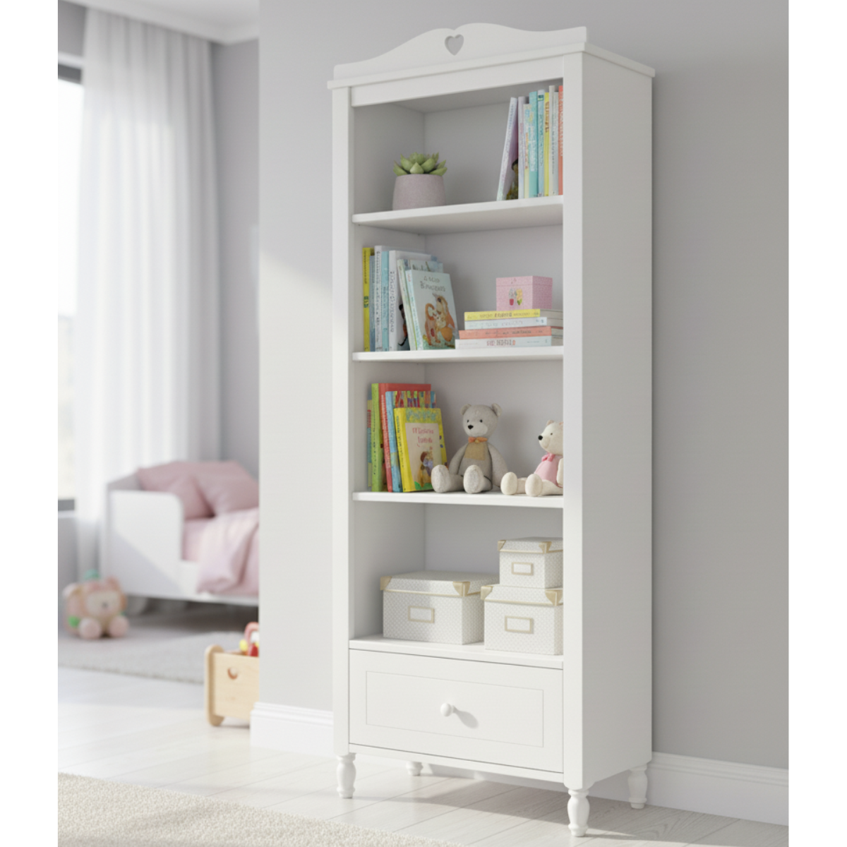 Klasyczny biały kolor sprawia, że regał do pokoju dziecięcego doskonale pasuje do różnych aranżacji – od romantycznych pokoi dziewczynek po nowoczesne wnętrza dziecięce. Subtelny detal w postaci wycięcia w kształcie serca nadaje meblowi wyjątkowego, dziewczęcego charakteru.