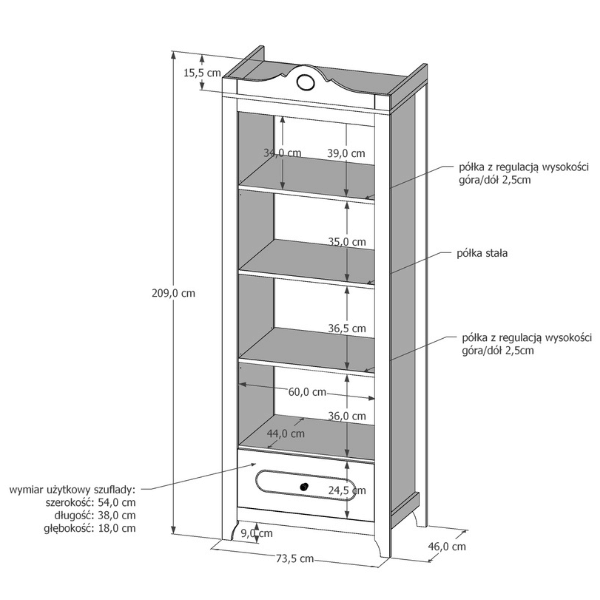 Trzy otwarte półki to idealne miejsce na książki, zabawki, dekoracje i wszystkie niezbędne drobiazgi. - Pojemna szuflada