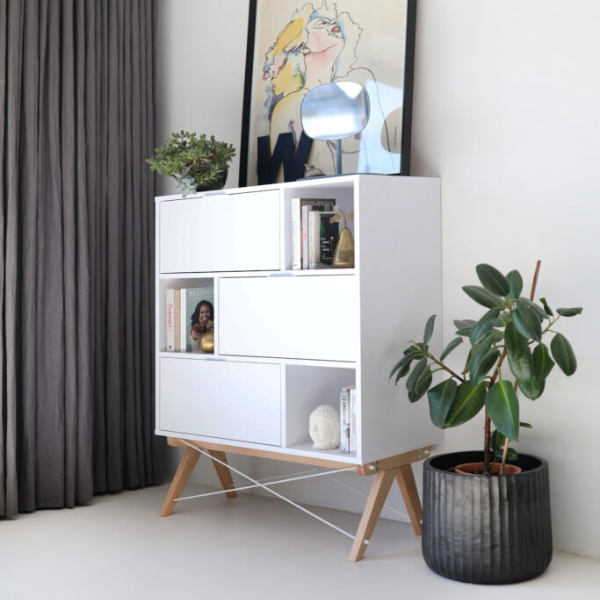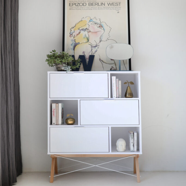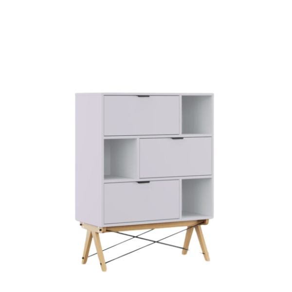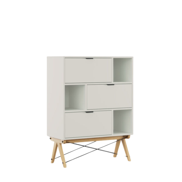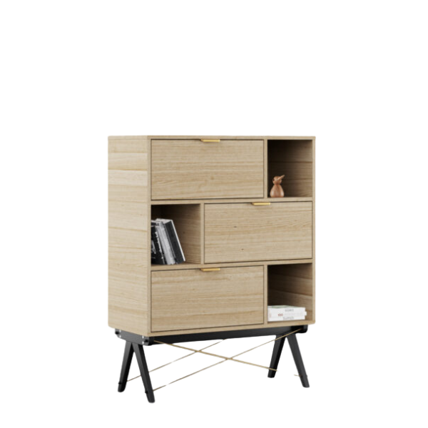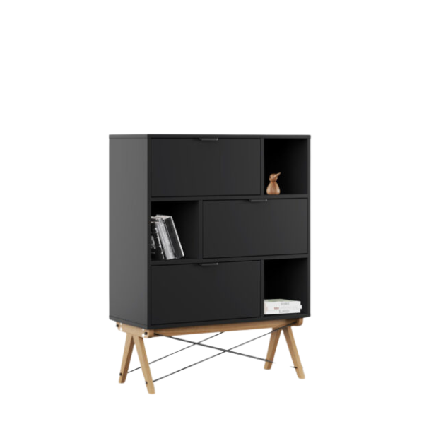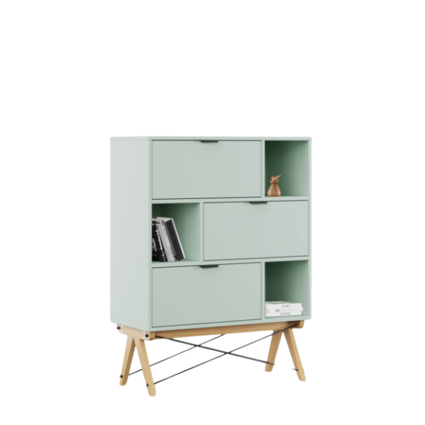 - Regał jest wyposażony w otwarte półki i trzy fronty uchylne (otwierane do dołu).