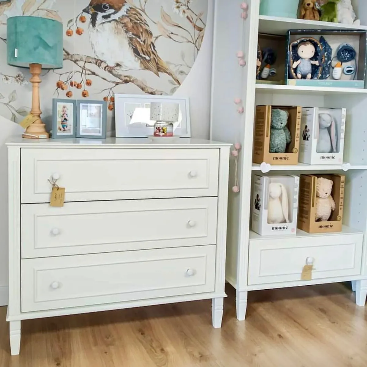 Stylowe frezy, kolor złamanej bieli i wysokie nóżki sprawiają, że mebel pasuje zarówno do klasycznych, jak i bardziej eleganckich wnętrz w stylu art deco. To świetny wybór, jeśli chcesz wykorzystać przestrzeń w pionie i zyskać więcej miejsca do przechowywania bez przytłaczania pokoju dziecka.