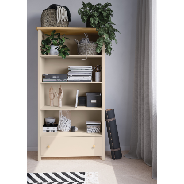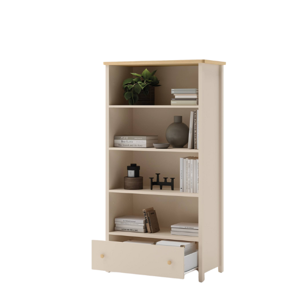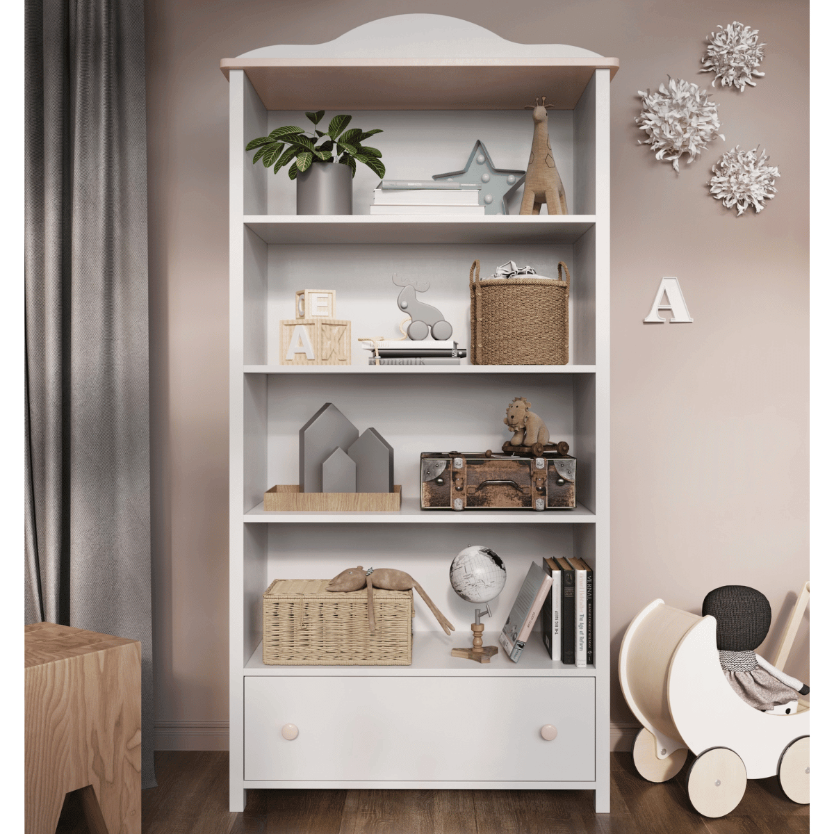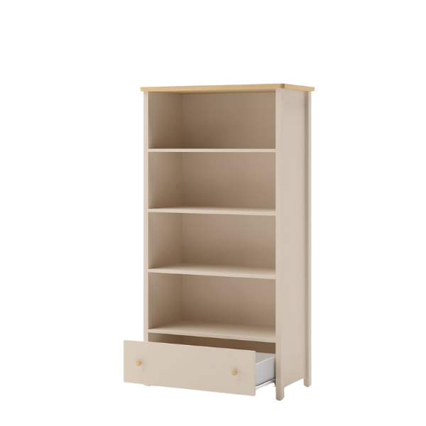 Przemyślany układ czterech pojemnych półek i praktycznej szuflady pozwala wygodnie przechowywać książki, zabawki, dekoracje i inne dziecięce drobiazgi. Regał ułatwia utrzymanie porządku, a jego otwarta konstrukcja sprzyja samodzielności dziecka – wszystko znajduje się w zasięgu ręki. Dzięki temu mebel doskonale sprawdzi się zarówno w pokoju malucha, jak i starszaka, stając się ważnym elementem codziennej organizacji przestrzeni.