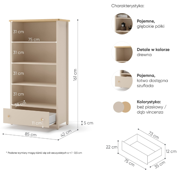 Drewniany regał dziecięcy Story to połączenie funkcjonalności, estetyki i ponadczasowego stylu, które idealnie wpisuje się w potrzeby współczesnych wnętrz. Jego ciepła kolorystyka beż piaskowy / dąb vincenza bielony sprawia, że regał doskonale komponuje się z aranżacjami w stylu boho, skandynawskim lub naturalnym, wprowadzając do pokoju dziecka przytulność i harmonię. To mebel, który nie tylko porządkuje przestrzeń, ale także ją zdobi – subtelny, ale jednocześnie wyrazisty w swojej prostocie.