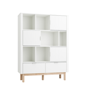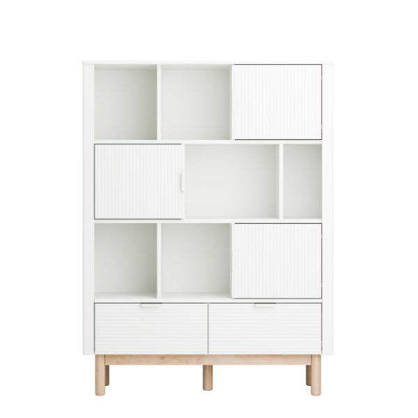 Ryflowane fronty, eleganckie detale i zaokrąglone bukowe nóżki nadają regałowi wyjątkowego charakteru i lekkości, tworząc spójny, ponadczasowy design.
