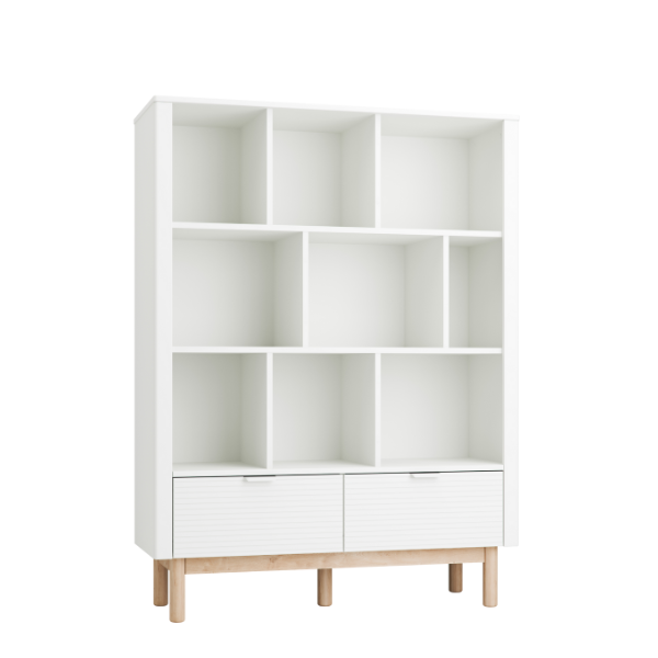 Przemyślany układ półek oraz pojemna szuflada zapewniają dużą przestrzeń do przechowywania książek, zabawek i dziecięcych akcesoriów. To funkcjonalny regał dziecięcy, który ułatwia organizację i pomaga utrzymać porządek każdego dnia.
