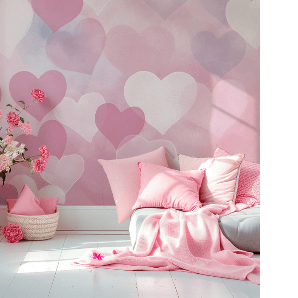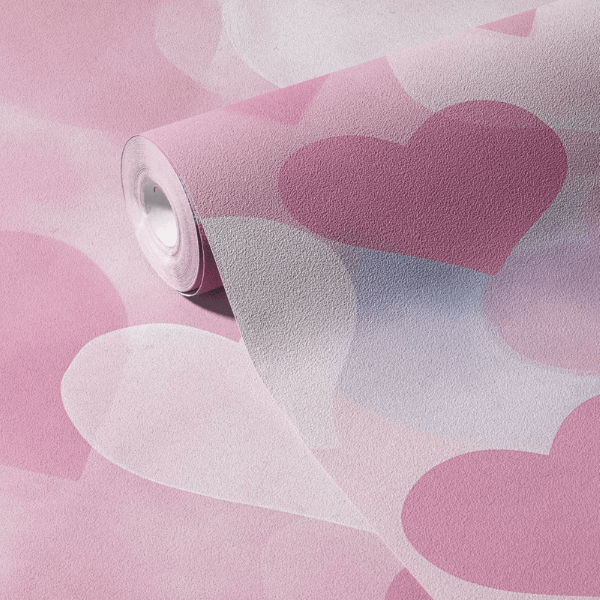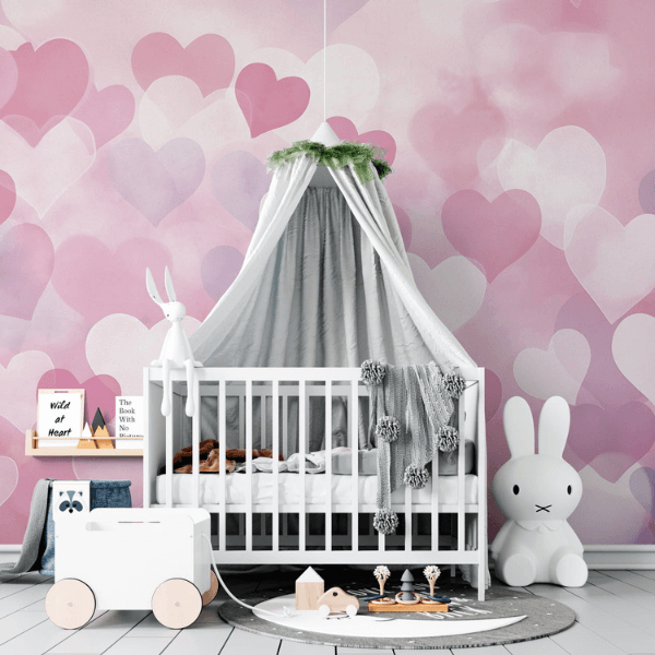 to wyjątkowa dekoracja ścienna, która wypełnia dziecięcy pokój ciepłem, delikatnością i bajkowym urokiem. Subtelne, pastelowe serca unoszące się na miękkim, różowo-lawendowym tle tworzą lekką, niemal marzycielską kompozycję, idealną dla małych księżniczek i miłośniczek romantycznych wnętrz. Akwarelowy efekt sprawia, że wzór wygląda niezwykle lekko i naturalnie, a przenikające się odcienie różu, bieli i pudrowego fioletu wprowadzają harmonię oraz spokój.