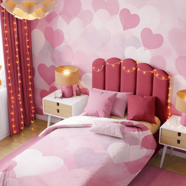 Motyw serduszek symbolizuje miłość, bezpieczeństwo i czułość, dzięki czemu tapeta doskonale sprawdzi się zarówno w pokoju niemowlaka, jak i starszego dziecka. Delikatny wzór nie przytłacza przestrzeni, a jednocześnie nadaje jej wyjątkowego, dziewczęcego charakteru. To idealne tło do codziennych zabaw, odpoczynku oraz wieczornych rytuałów zasypiania.