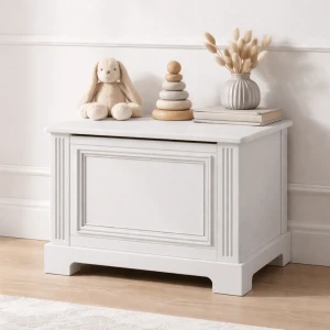 Skrzynia to praktyczne rozwiązanie dla rodziców, którzy chcą wygodnie przechowywać zabawki, książeczki, tekstylia i dziecięce skarby w jednym miejscu. Pojemna przestrzeń wewnątrz skrzyni ułatwia codzienną organizację, a uniwersalny design sprawia, że mebel dobrze prezentuje się także w sypialni lub salonie.