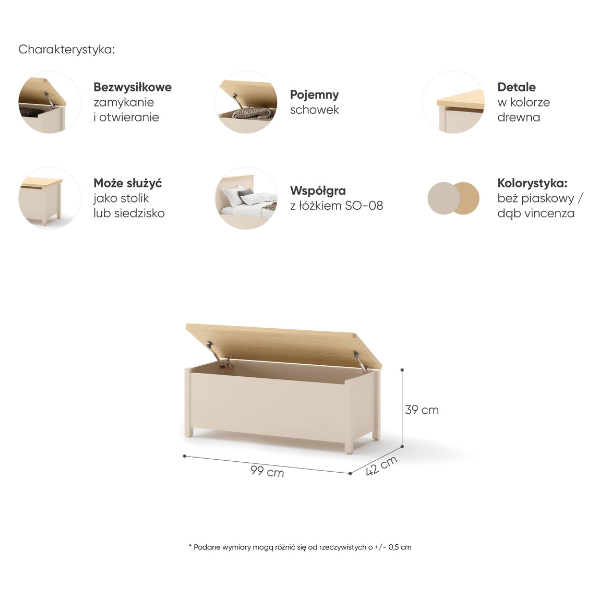 Utrzymany w ciepłej kolorystyce beż piaskowy / dąb vincenza bielona, kontener idealnie komponuje się z pozostałymi meblami z kolekcji Story, tworząc spójną i harmonijną całość. Subtelne, naturalne wykończenie sprawia, że doskonale wpasowuje się w wnętrza urządzone w stylu boho, skandynawskim lub nowoczesnym, dodając im przytulności i elegancji.