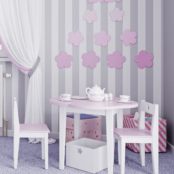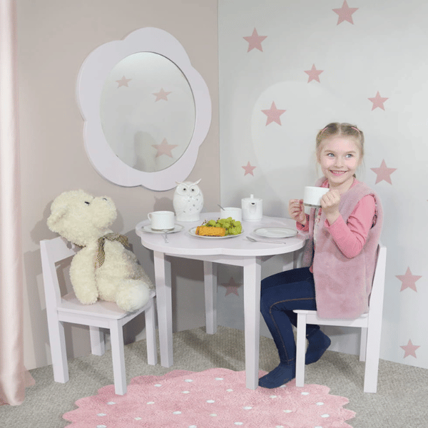 stanowi doskonałe dodatkowe wyposażenie do pokoju dla małych dziewczynek. Jest praktycznym i wielofunkcyjnym meblem, idealnym do zabawy, nauki i tworzenia rysunków. To nie tylko funkcjonalne wyposażenie, ale także świetny element dekoracyjny, który doda nowego charakteru oraz stworzy przytulną atmosferę w pokoju. Charakterystyczny blat stolika został zaprojektowany w formie kwiatu.