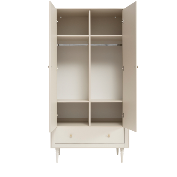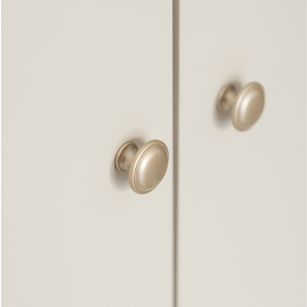 Złote uchwyty, lekkie bukowe nóżki i dopracowane proporcje sprawiają, że szafa idealnie wpisuje się w styl nowoczesny, japandi, skandynawski i klasyczny.