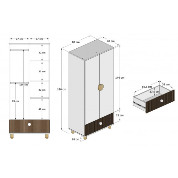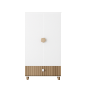Ta szafa dwudrzwiowa do pokoju dziecięcego została zaprojektowana tak, aby zapewnić maksymalną wygodę przechowywania ubrań oraz akcesoriów dziecka. Dzięki przemyślanemu układowi wnętrza mebel pomaga utrzymać porządek w garderobie zarówno małego dziecka, jak i starszaka.
