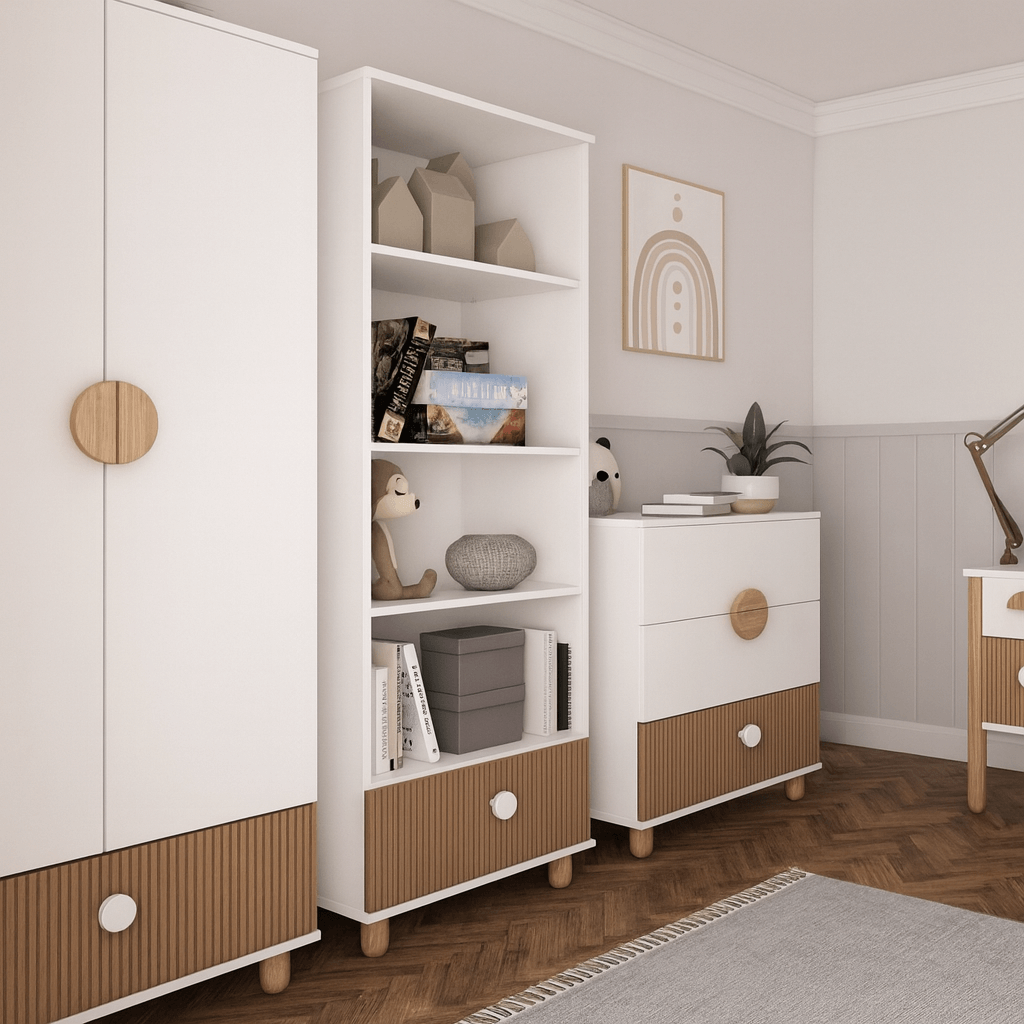 Biała szafa dziecięca to jeden z najbardziej uniwersalnych wyborów do nowoczesnych wnętrz. Jasna kolorystyka optycznie powiększa przestrzeń, rozjaśnia pokój dziecka i doskonale komponuje się z naturalnym drewnem.